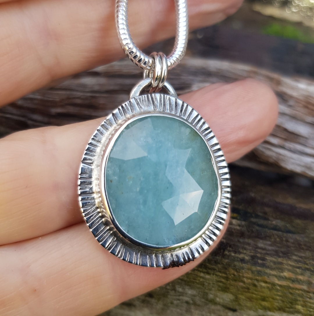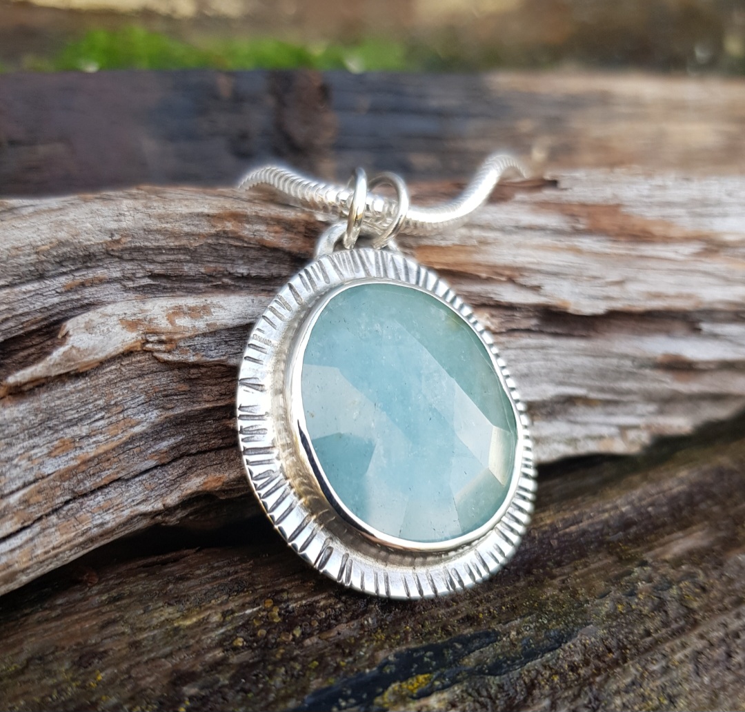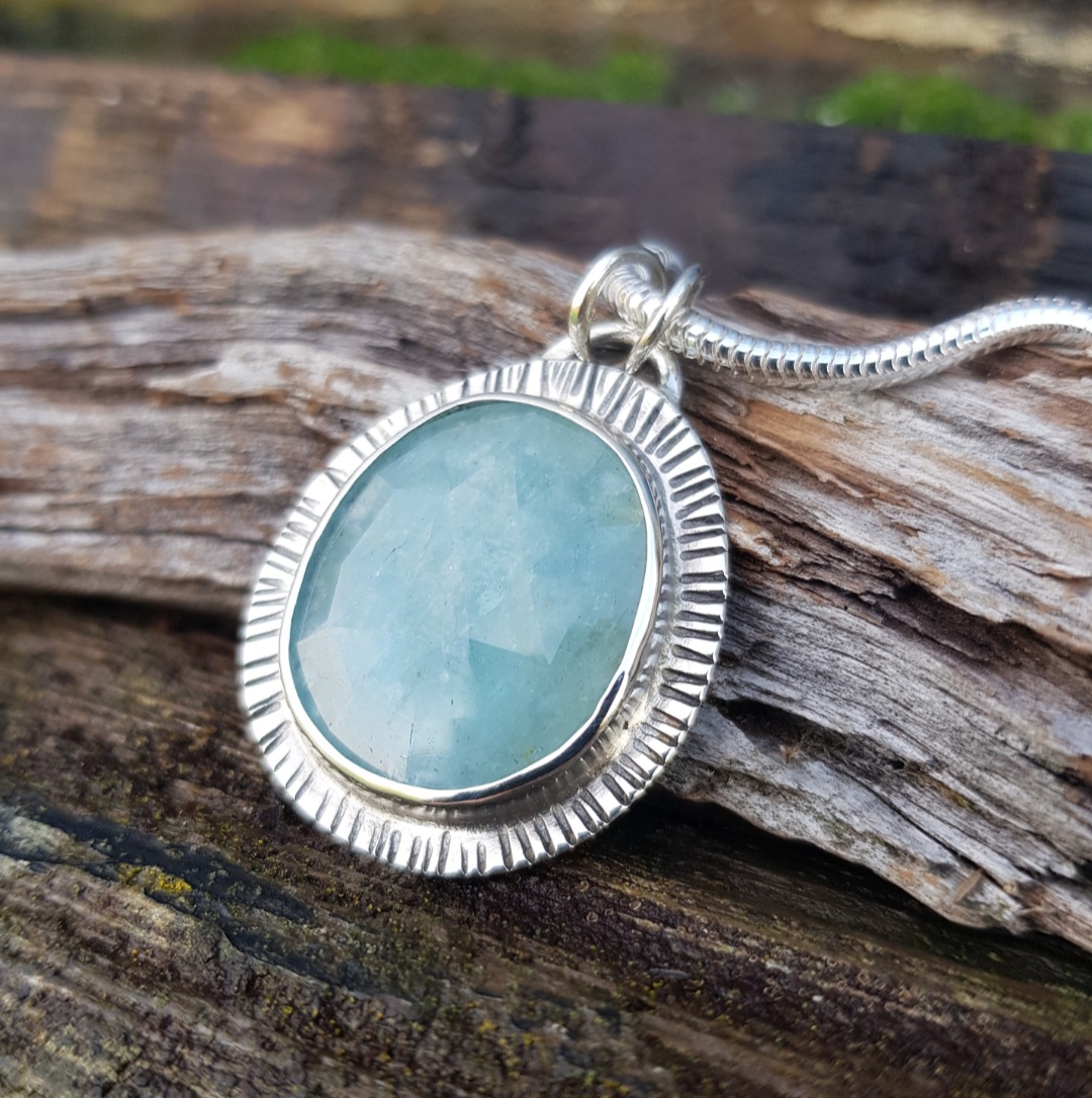 Blue Monday doesn’t have to be bad if the blue is the shimmer of a big rose cut Aquamarine gemstone. I bought some gemstones from another jeweller at Christmas time and this was in the collection. A big beautiful Aquamarine measuring 20mm x 25mm. Set in solid sterling silver, with a line textured surround, the pendant measures 28mm x 26mm and weighs 7.7g, including the Aquamarine which weighs 3g. I added a discreet bail from the back of the pendant with two rings for the chunky chain to run through.