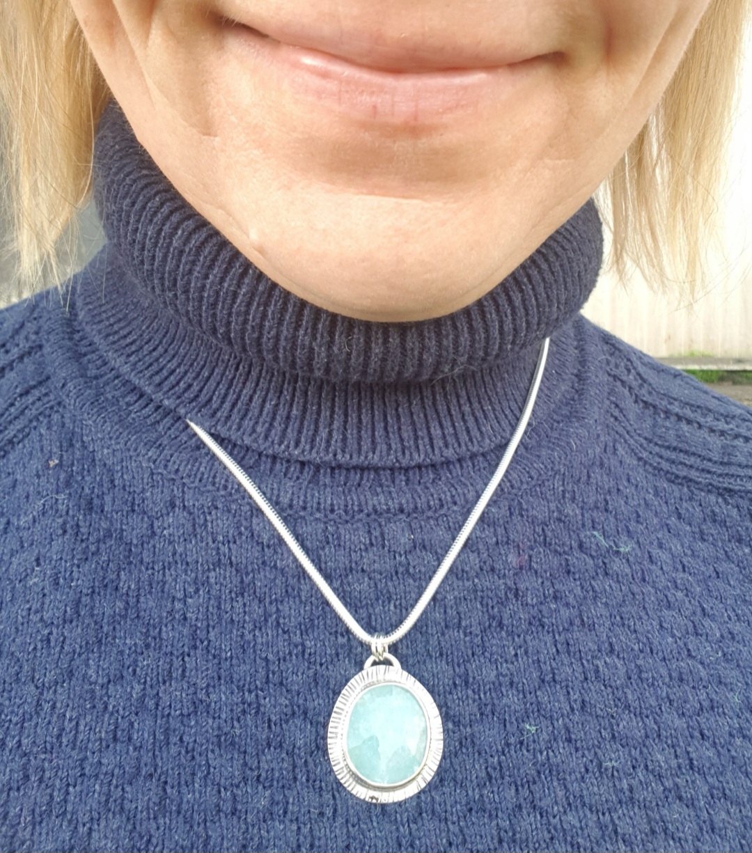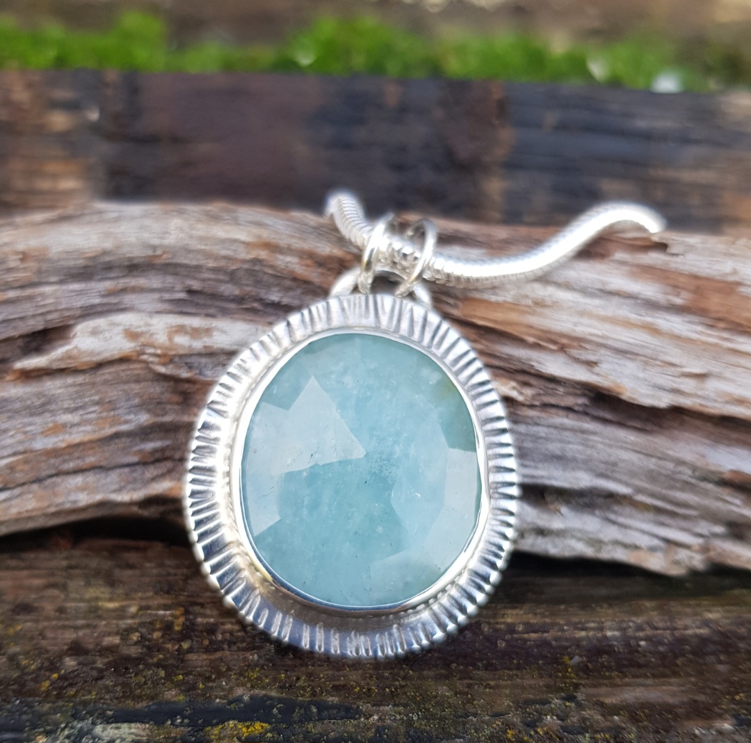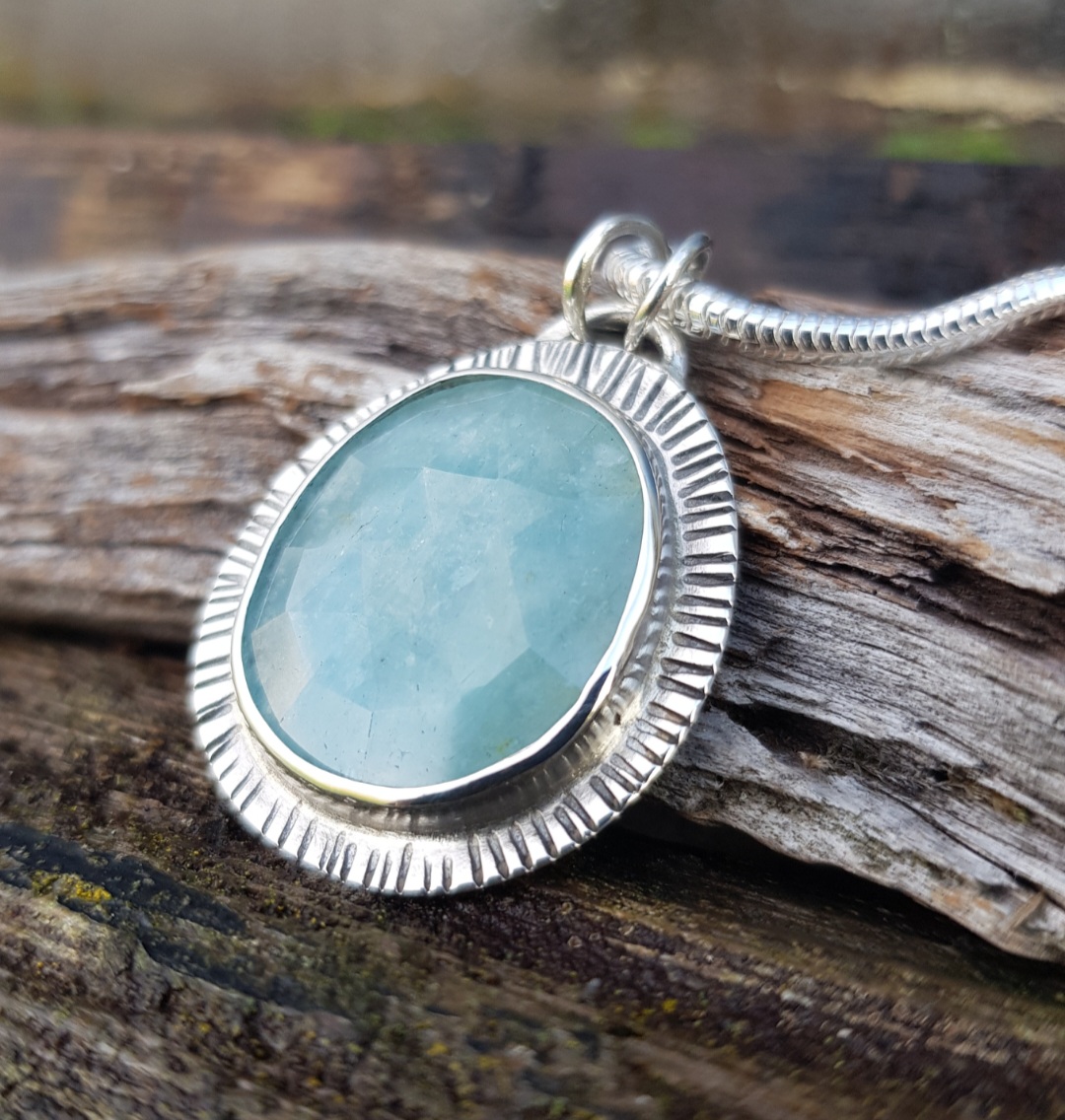 Blue Monday doesn’t have to be bad if the blue is the shimmer of a big rose cut Aquamarine gemstone. I bought some gemstones from another jeweller at Christmas time and this was in the collection. A big beautiful Aquamarine measuring 20mm x 25mm. Set in solid sterling silver, with a line textured surround, the pendant measures 28mm x 26mm and weighs 7.7g, including the Aquamarine which weighs 3g. I added a discreet bail from the back of the pendant with two rings for the chunky chain to run through.