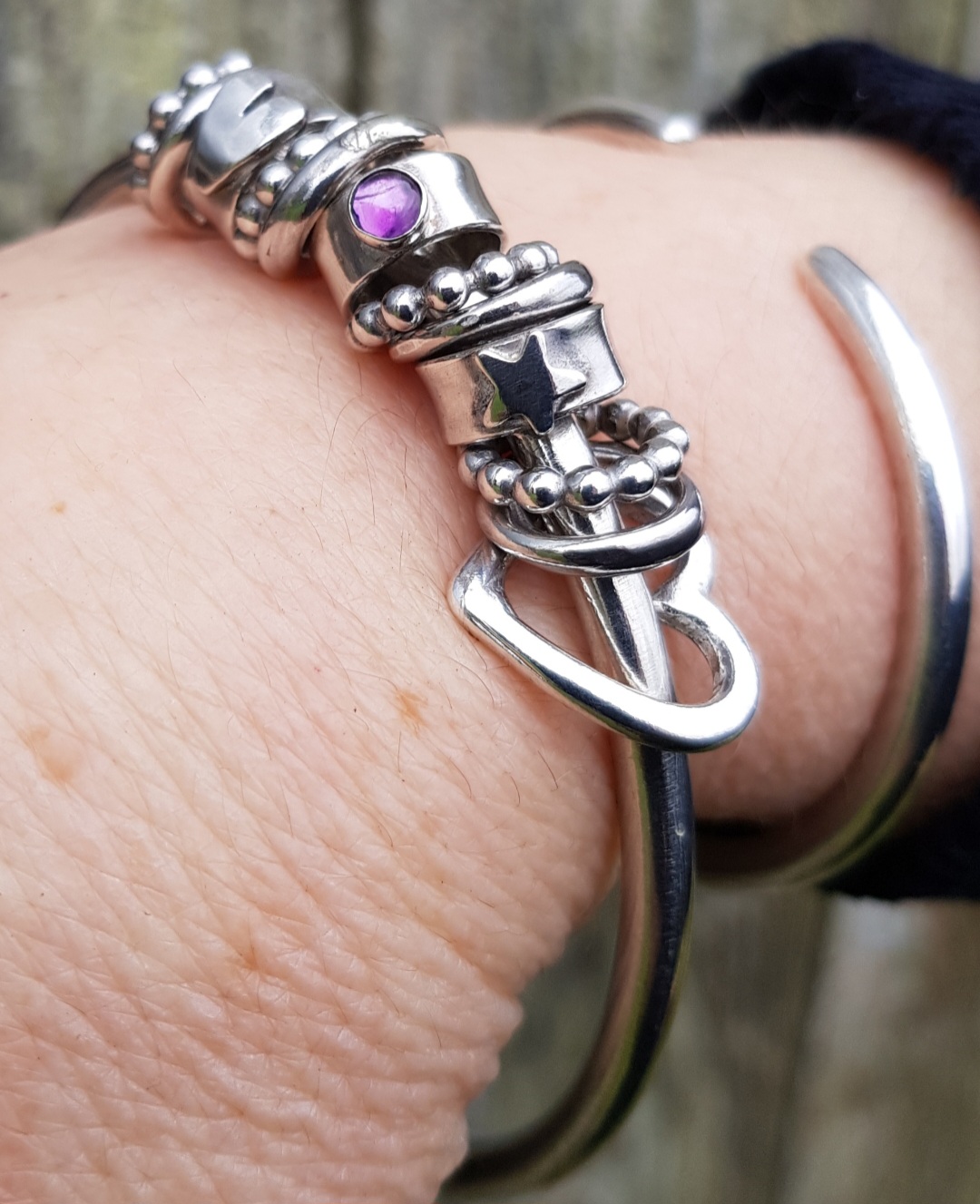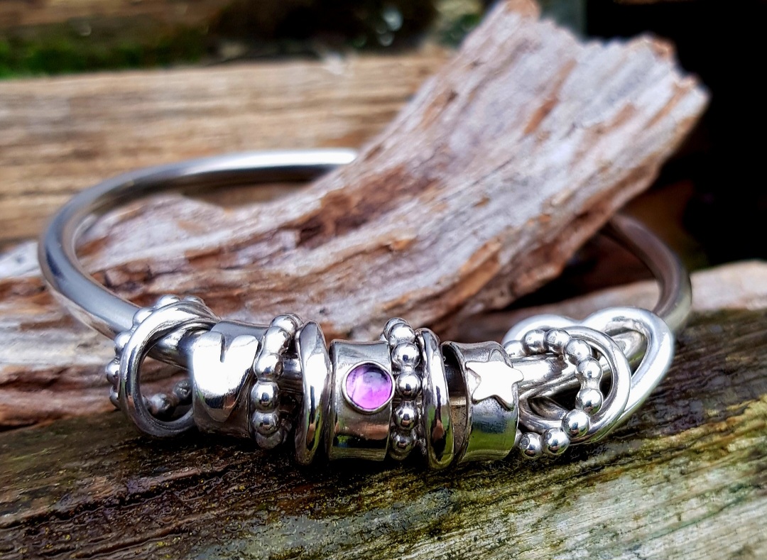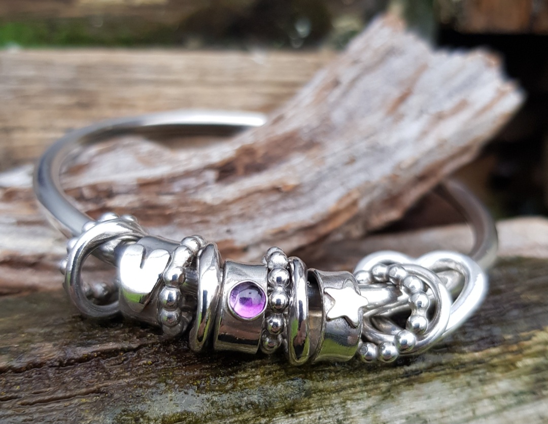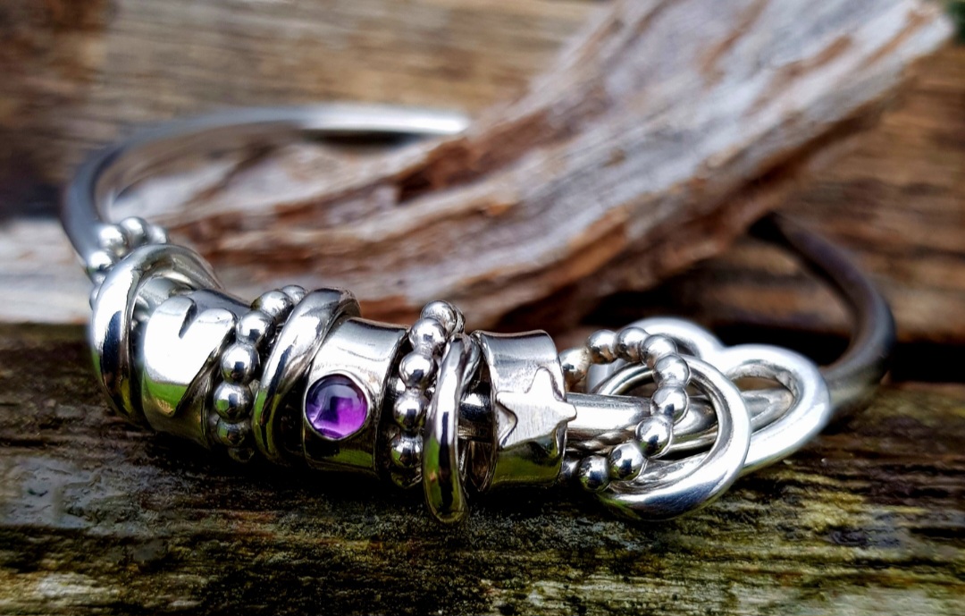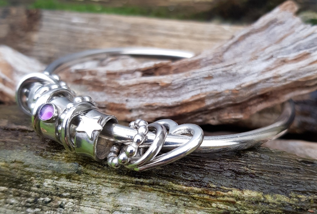 I went with the 4mm thick chunky solid sterling silver wire for the bangle and added some slightly chunkier charms to the mix too. The four dotty rings are 2.5mm thick and the four, usually flat rings, are made out of 2.5×1.7mm oval wire, which I twisted to add further texture. The 2.5mm thick open heart charm and the rings charms are the same as standard and this time I added three ring charms, one with a 4mm African Amethyst (perfect for a February Birthday), one with a silver star and one with a silver handcut heart.