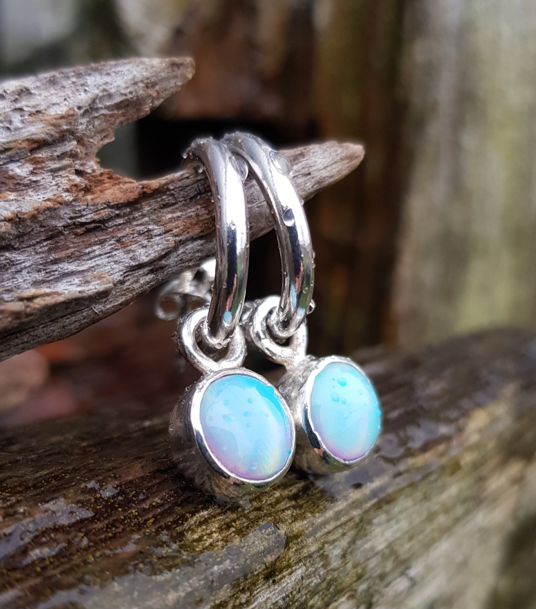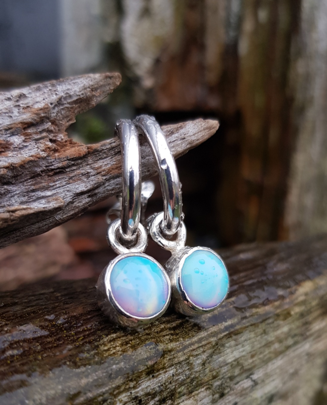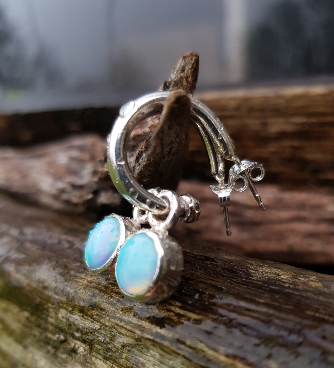 These hoops are chunky, made out of 2.5mm thick solid sterling silver round wire. Their diameter measures 18mm and they have a post and butterfly closure. The Aurora Opals are 10mm in diameter and have been set in solid sterling silver rub-over handmade settings. The loop bails allow them to easily move around on the hoop but I have soldered balls onto the end of the hoop to ensure the charms stay on.