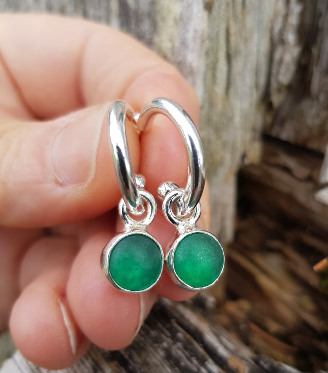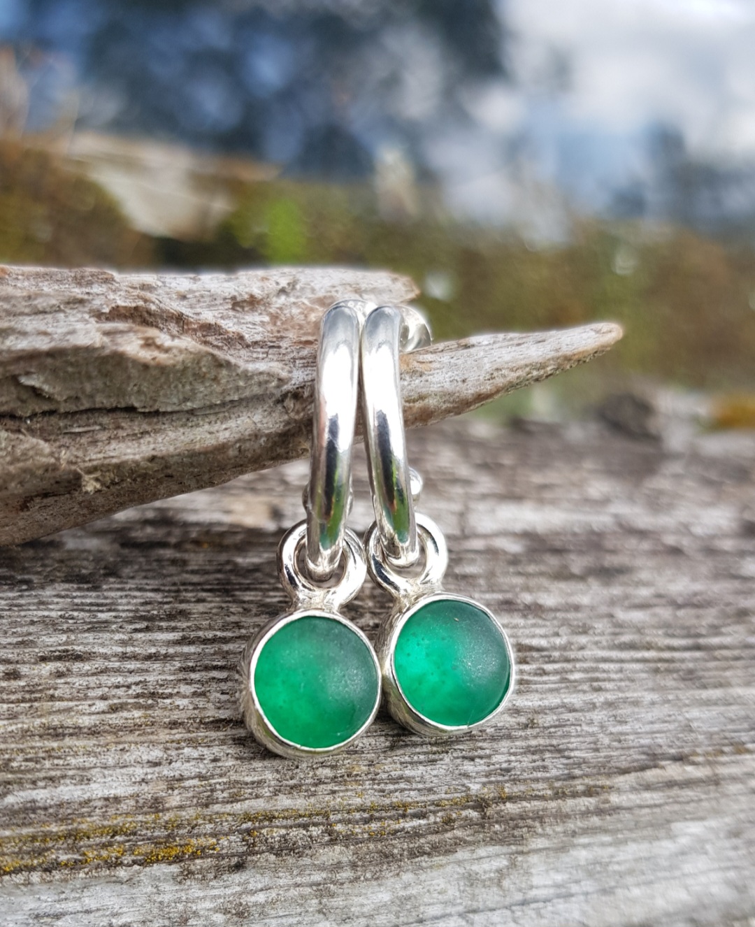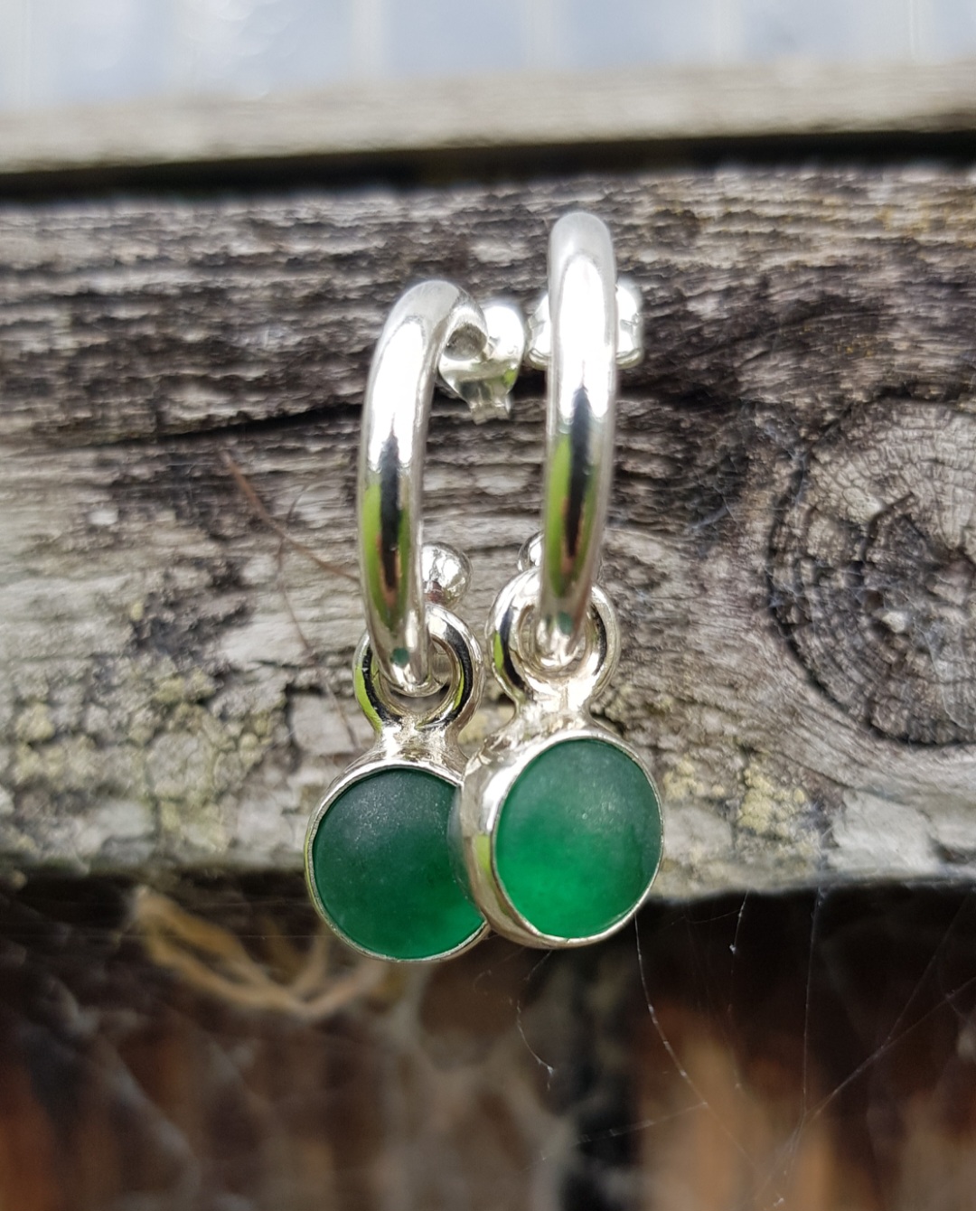 I have really loved making these chunky solid sterling silver hoops with charms. This pair is extra special because the charms include pieces of vibrant green seaglass from the north west coast of Scotland.