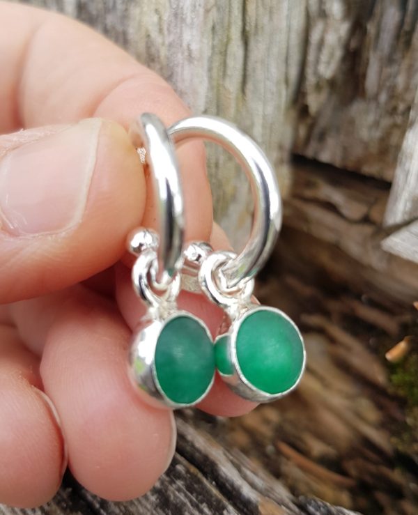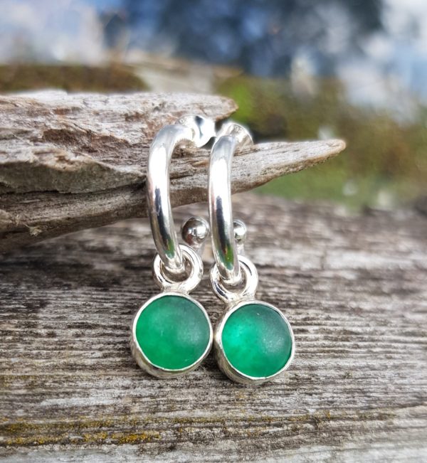 I have really loved making these chunky solid sterling silver hoops with charms. This pair is extra special because the charms include pieces of vibrant green seaglass from the north west coast of Scotland.