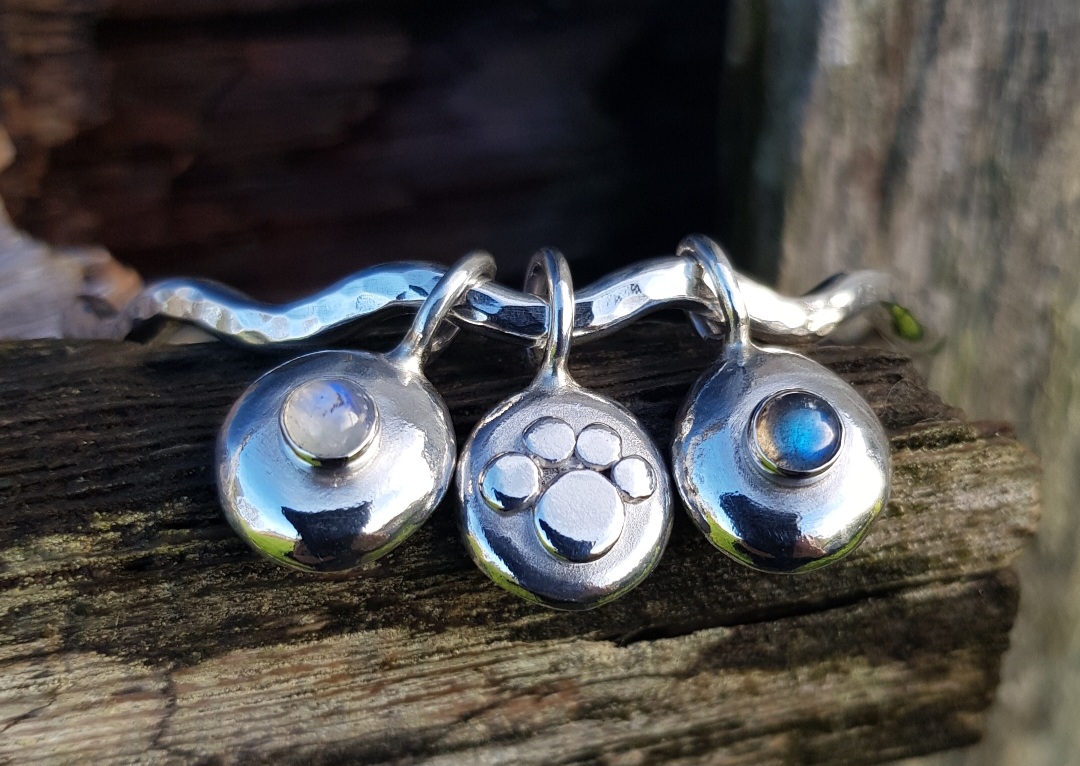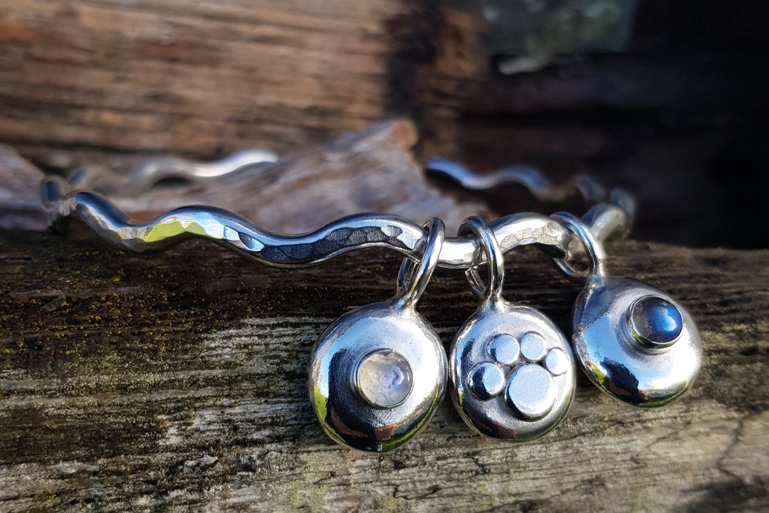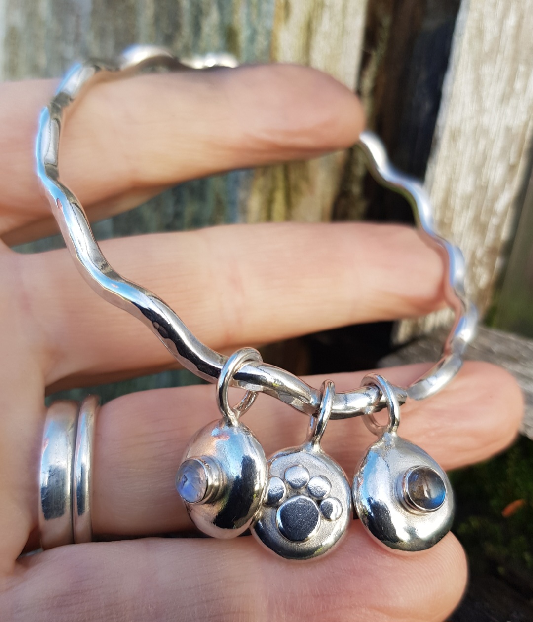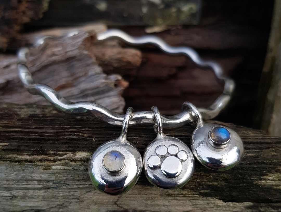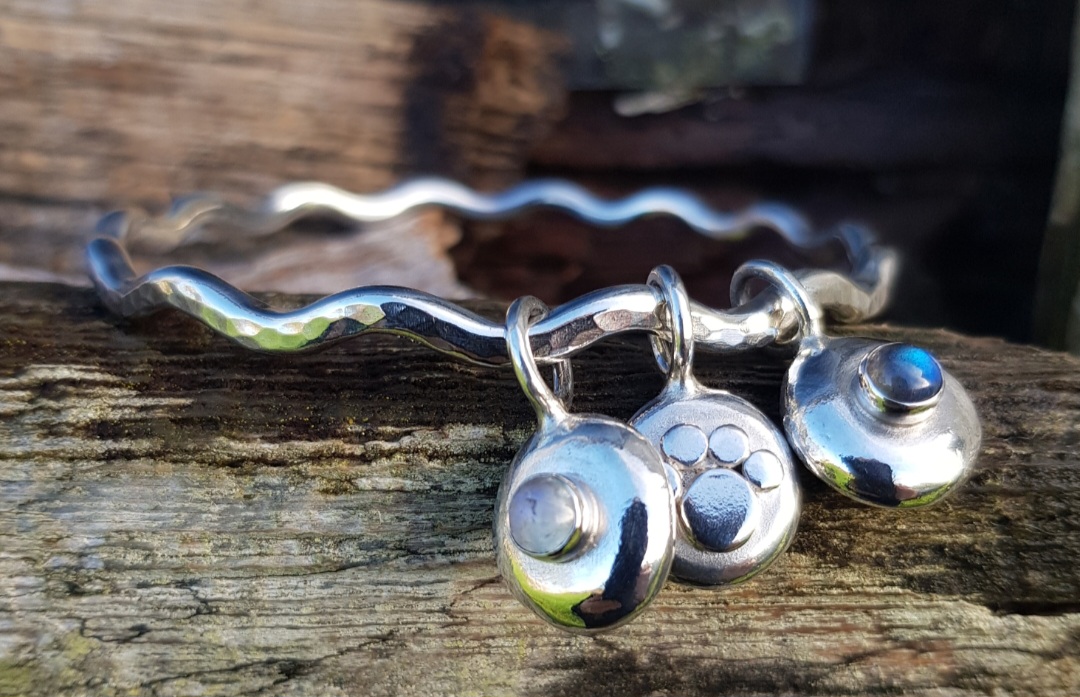 The bangle is a chunky 3.5mm thick solid sterling silver bangle, which I have made into a Squiggle Bangle and given the sparkle texture to catch the light. The three charms, two gemstone pebble charms and one paw print pebble charm are all chunky and rotate the bangle individually and freely. The paw charm has ‘love’ stamped on the back of it and the gemstone pebbles are both textured on the back, from the heat of the torch.
