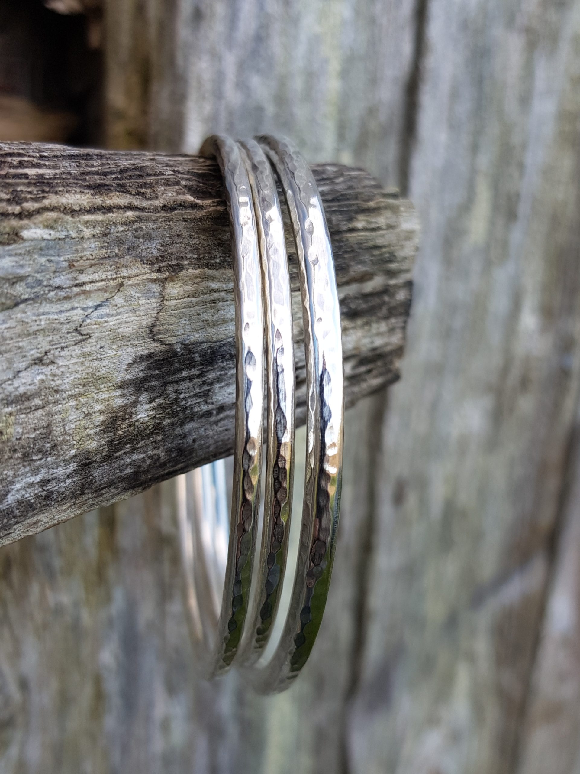 Two 6.5cm inside diameter 2.5mm thick solid sterling silver bangles with sparkle texture. £85 each.