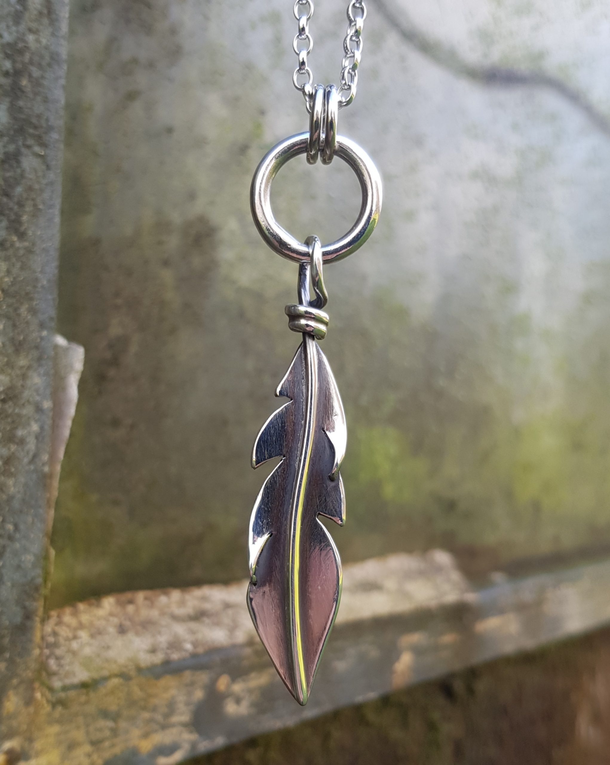 The feather hangs from a chunky 2.5mm thick sterling silver ring, I also attached two jumprings to this circle for the chunky 18″ sterling silver Belcher chain to run through.