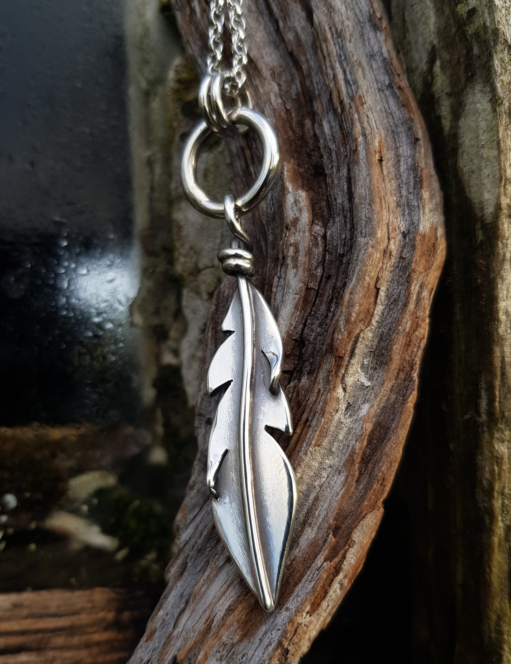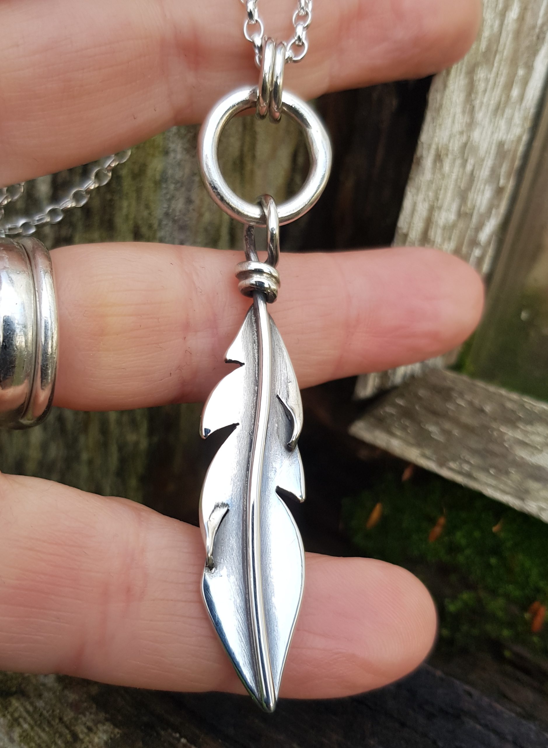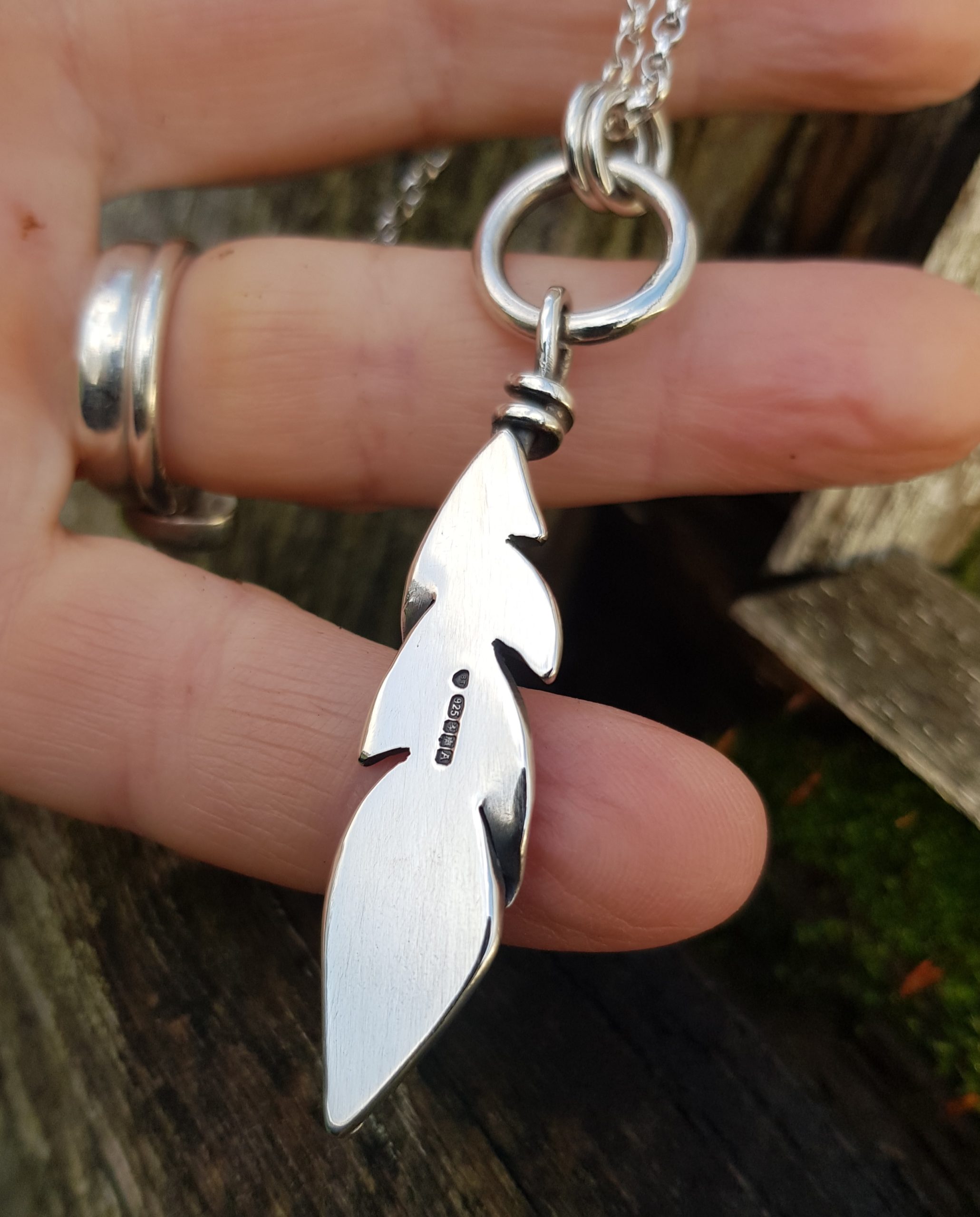 This feather pendant has been hand cut out of 1.5mm thick sterling silver sheet and measures 50mm in length x 10mm in width. I used 1.5mm thick wire to creat the rachis in the centre of the feather and used it to create the bail at the top, making the total length of the feather and bail 70mm. The total weight of the feather is 10.6g.