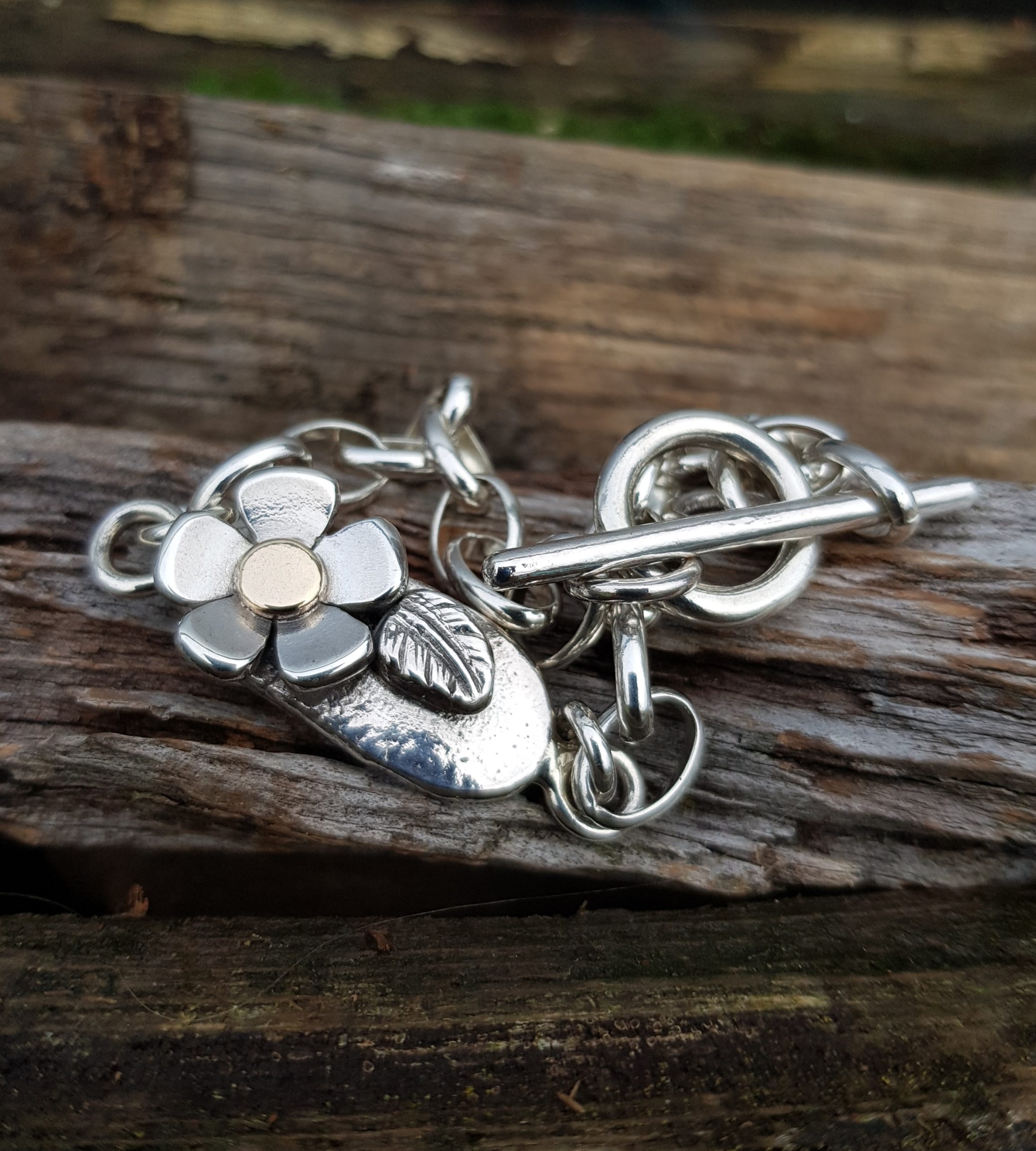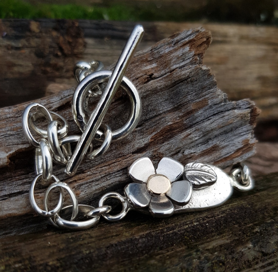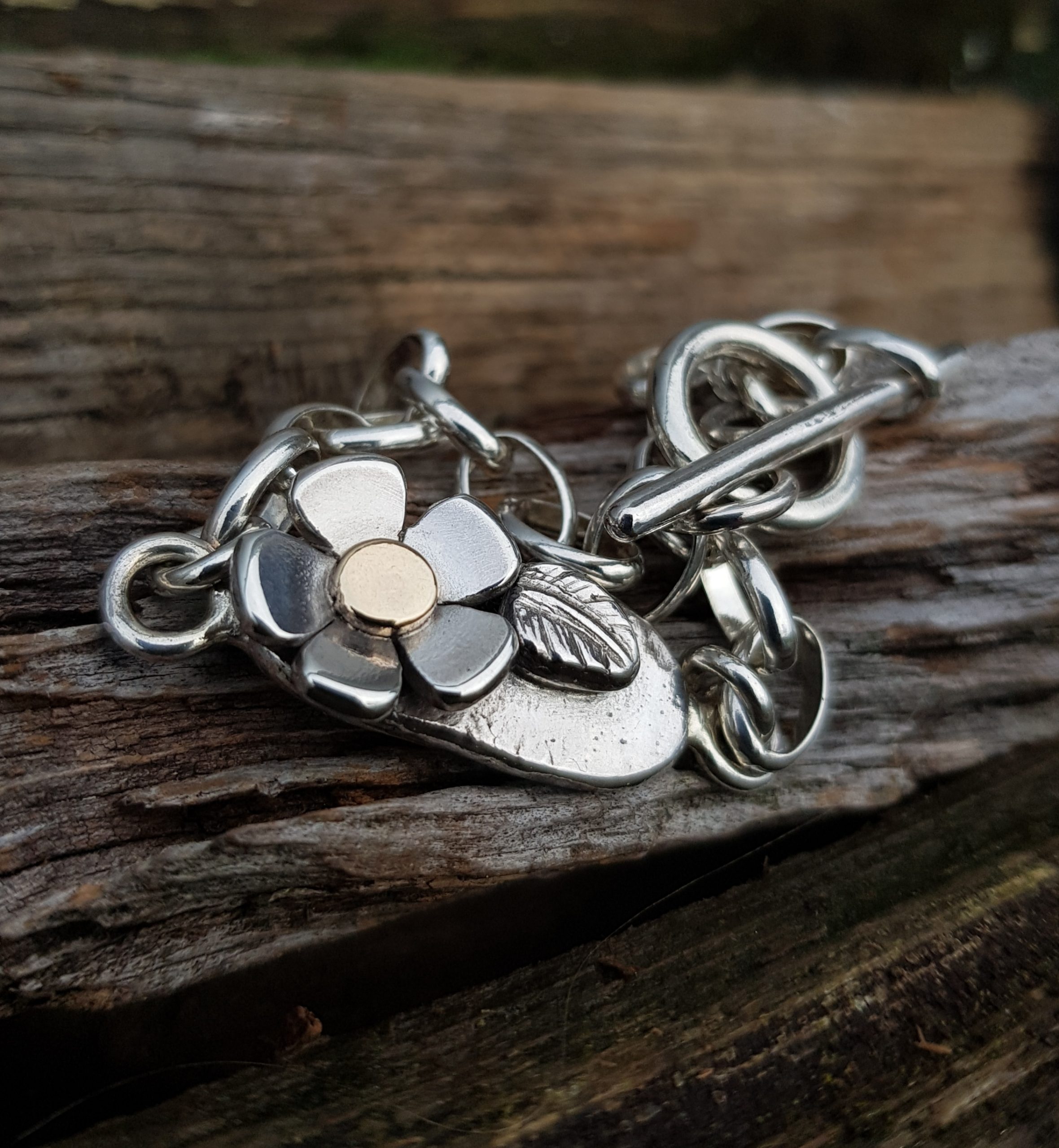 This is my favourite piece from Winter Exhibition I took part in. I made the flower first, handcut from 1.5mm thick sterling silver sheet and decided, rather than it being a dangly charm, I wanted it to be part of a solid feature of the bracelet. I made the centre of the flower a solid 9ct gold disc, which brought a bit of contrast to the piece.