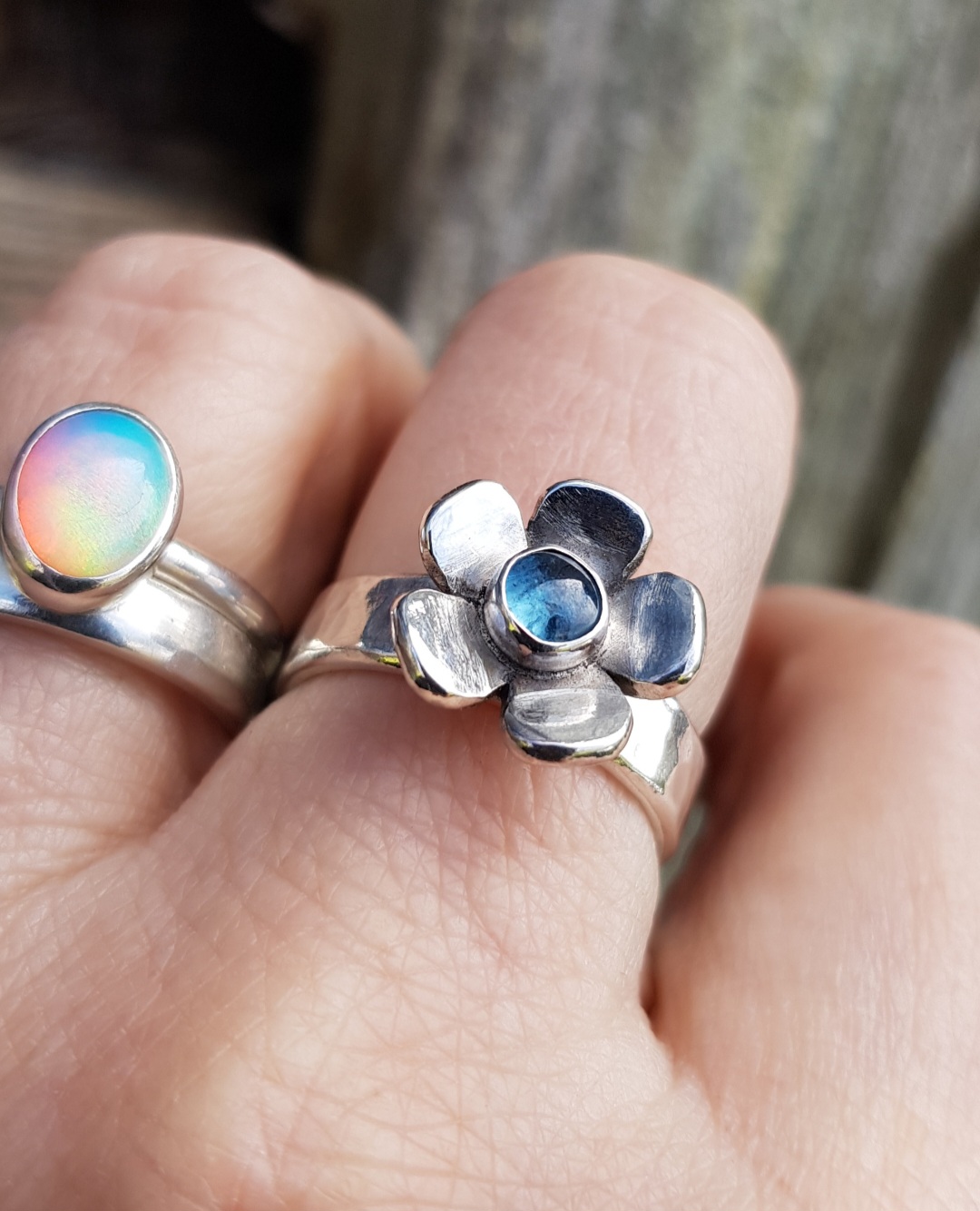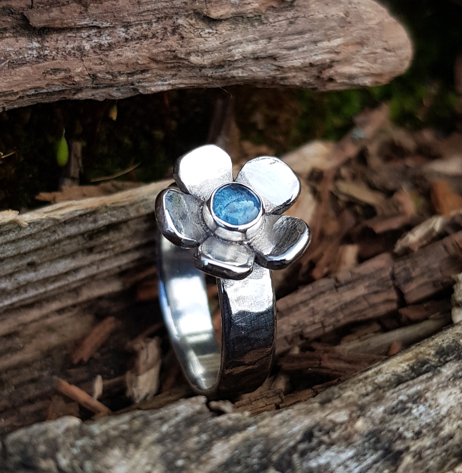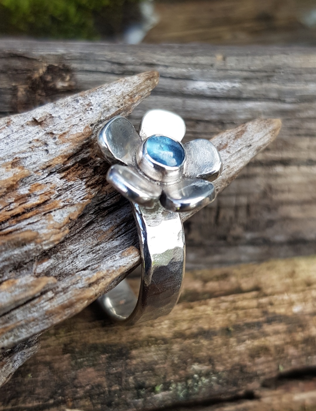 This chunky flower ring offered the perfect centre point to set one of my deep blue Kyanite cabochons. The flower has been handcut out if 1.5mm thick sterling silver sheet. Each petal shaped by hand and then the flower has been domed to give a lovely outward curve. The flower measures 15mm in diameter and the Kyanite is 5mm.