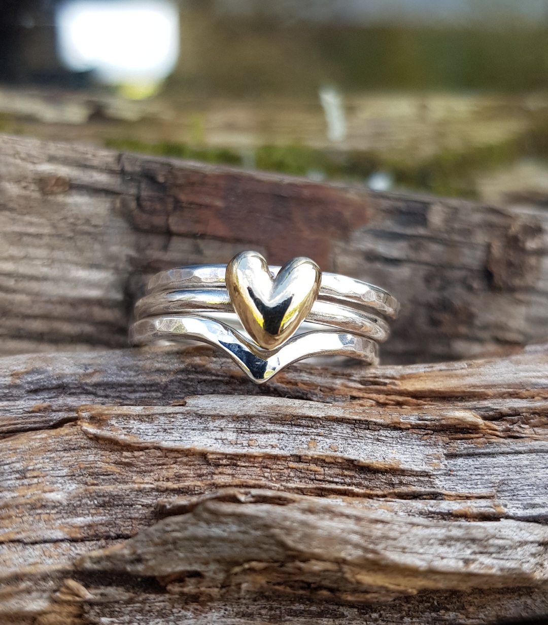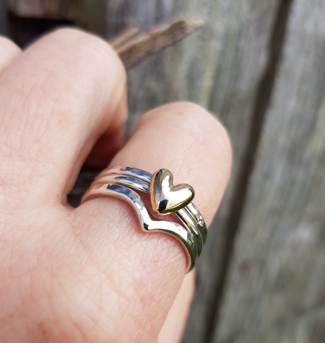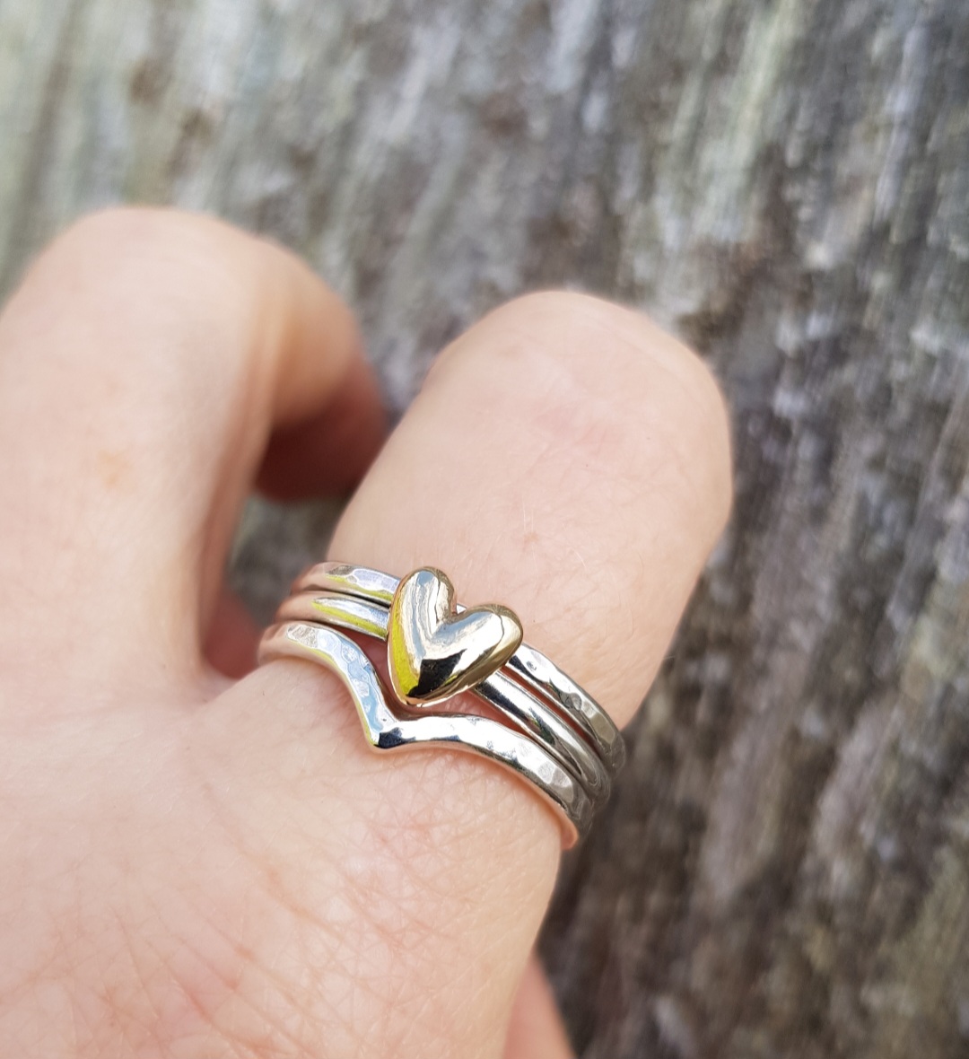 This set of three rings is a UK size T and consists of three of my popular rings. One of my new Honeymoon Rings with a chunky and tactile solid 9ct yellow gold heart and a smooth ring, a Sparkle Wishbone Ring with its V perfectly fitting the point of the heart and a Sparkle Spacer Ring adding a frame under the top of the heart and balancing the stack out.  Each of the rings are made out of 2mm thick sterling silver round wire making the total width 6mm.  The rings are pretty eye catching worn together but the real beauty of stacking rings is that you can split them up, wear them individually and add other rings to the collection too.  All three rings are available to order individually from my shop, if you don’t want the full set, and you can choose your required size in the drop down box.