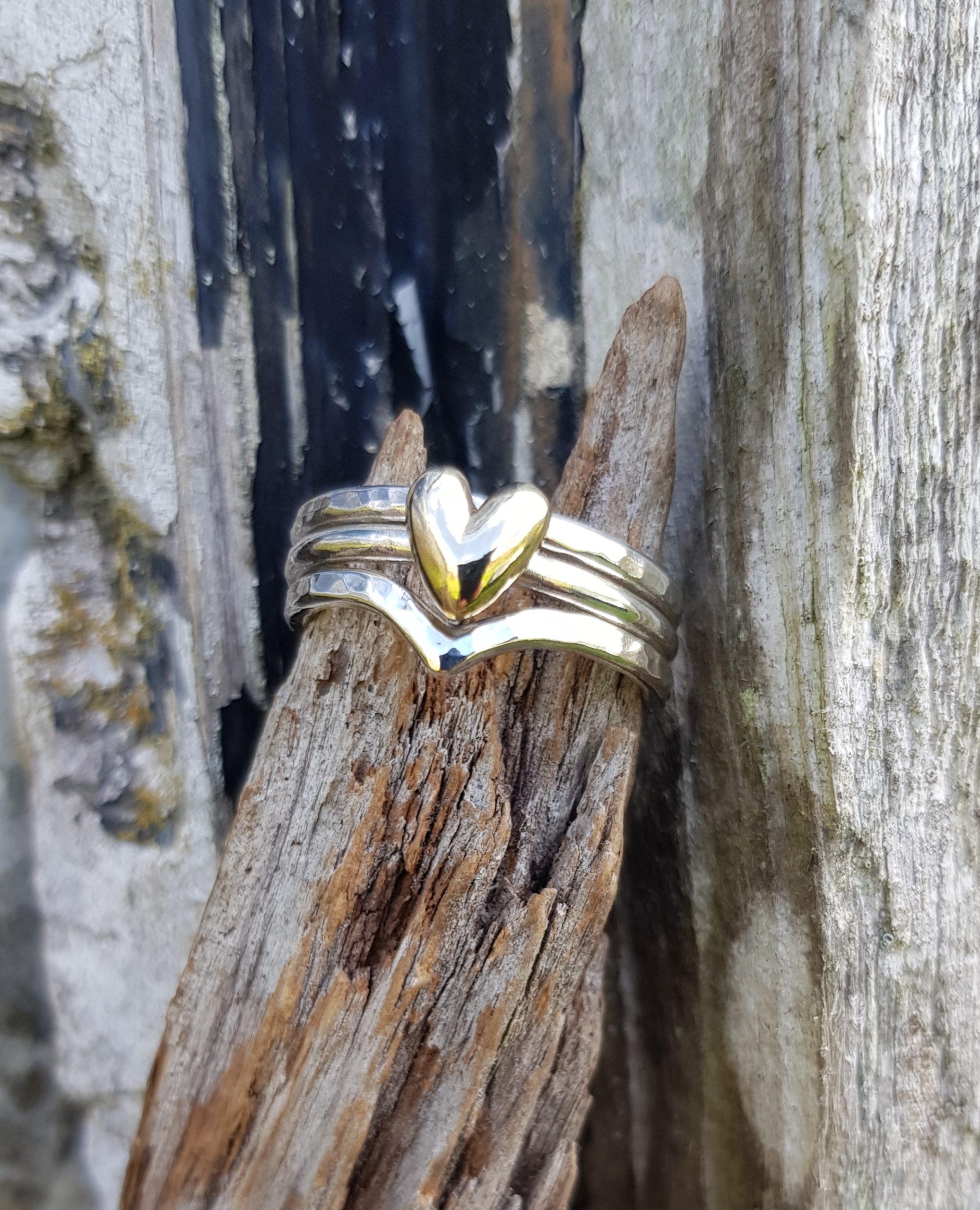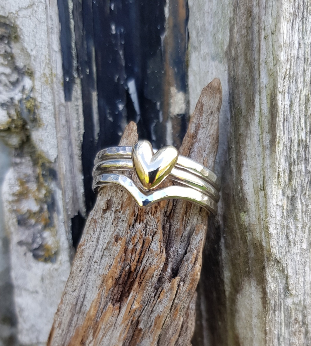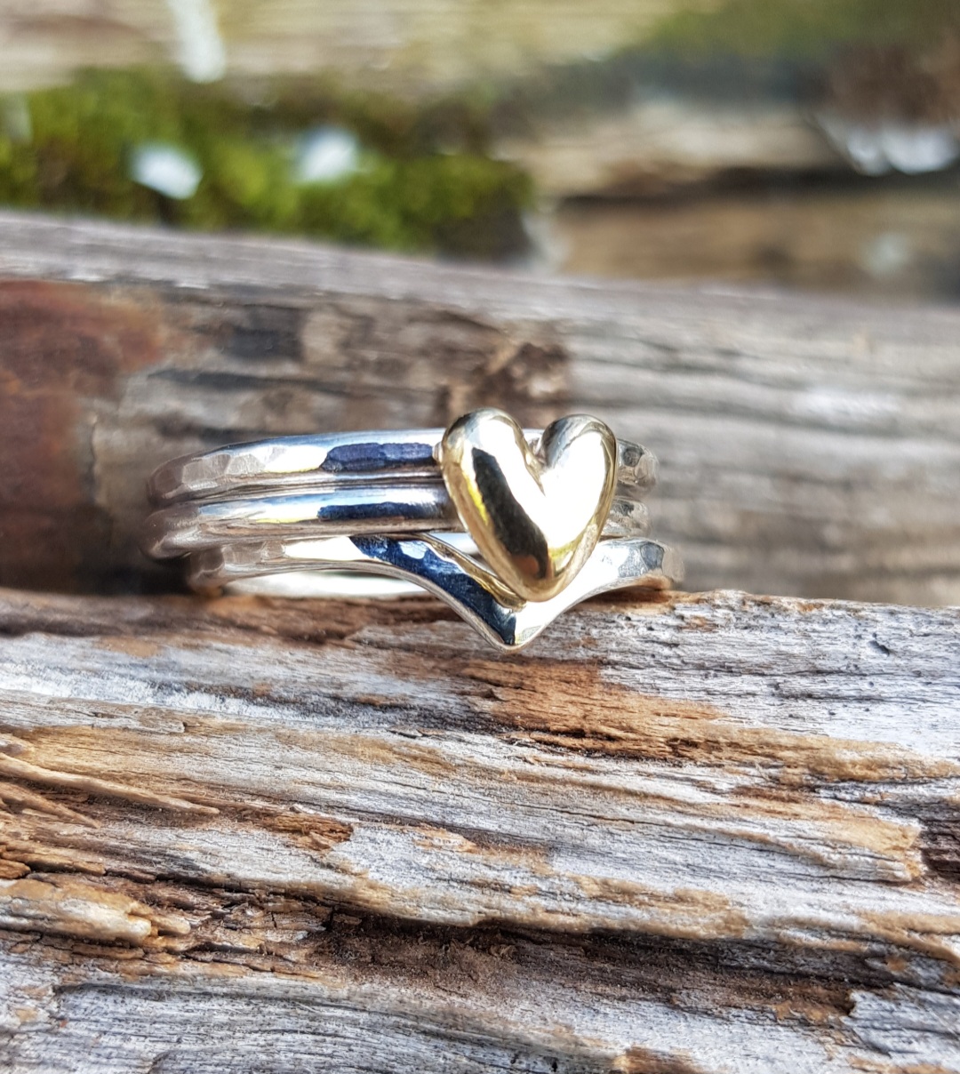 This set of three rings is a UK size T and consists of three of my popular rings. One of my new Honeymoon Rings with a chunky and tactile solid 9ct yellow gold heart and a smooth ring, a Sparkle Wishbone Ring with its V perfectly fitting the point of the heart and a Sparkle Spacer Ring adding a frame under the top of the heart and balancing the stack out.  Each of the rings are made out of 2mm thick sterling silver round wire making the total width 6mm.  The rings are pretty eye catching worn together but the real beauty of stacking rings is that you can split them up, wear them individually and add other rings to the collection too.  All three rings are available to order individually from my shop, if you don’t want the full set, and you can choose your required size in the drop down box.