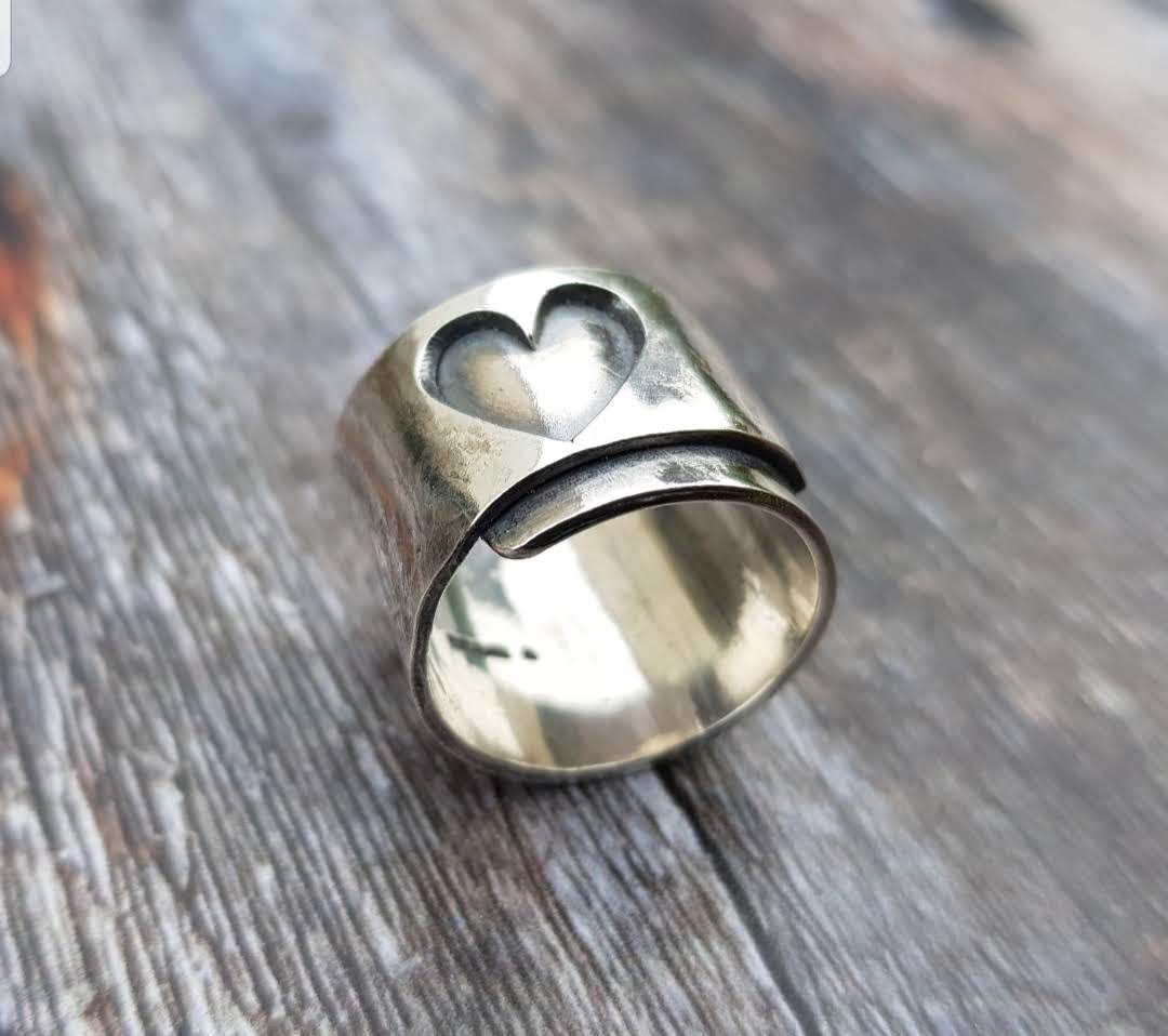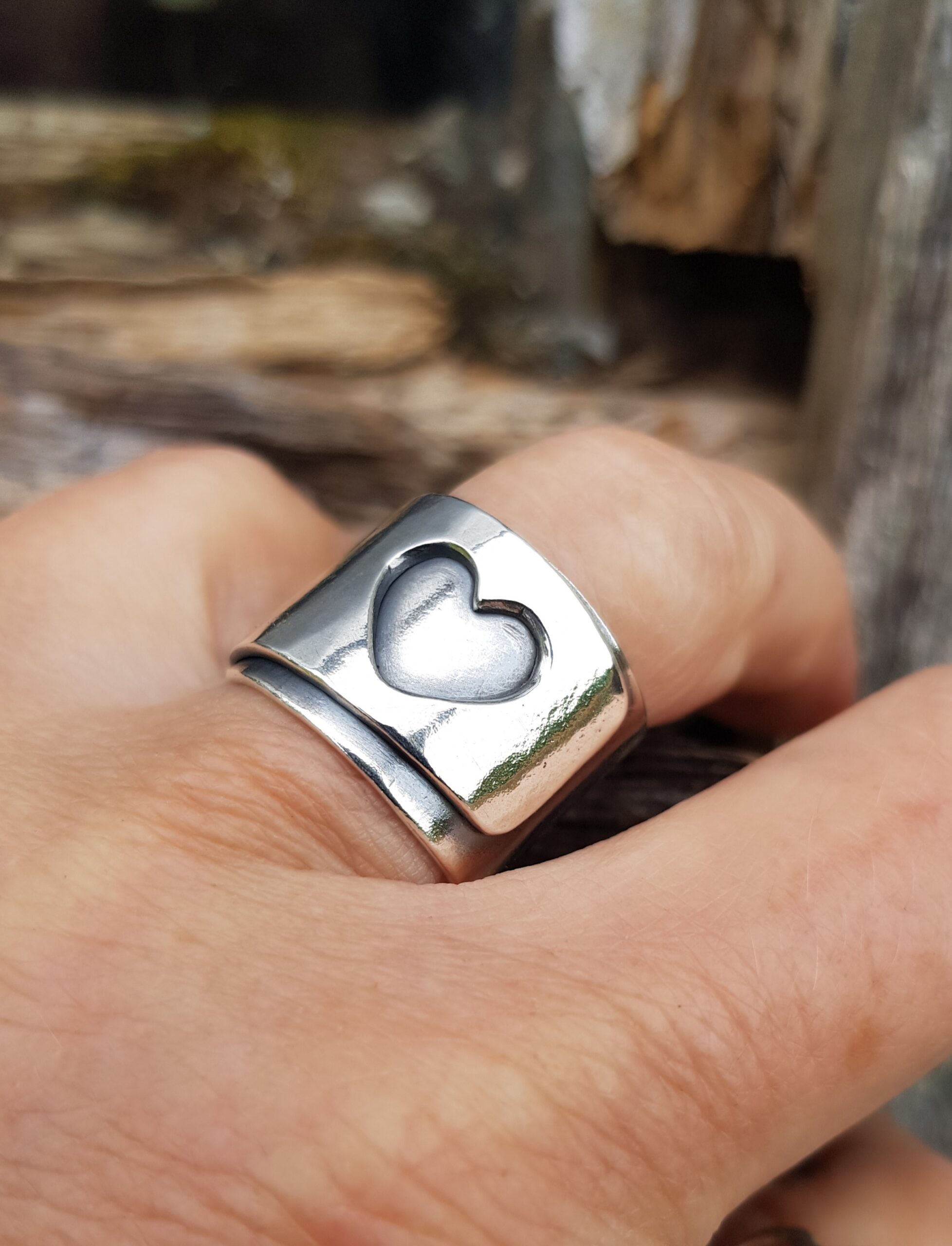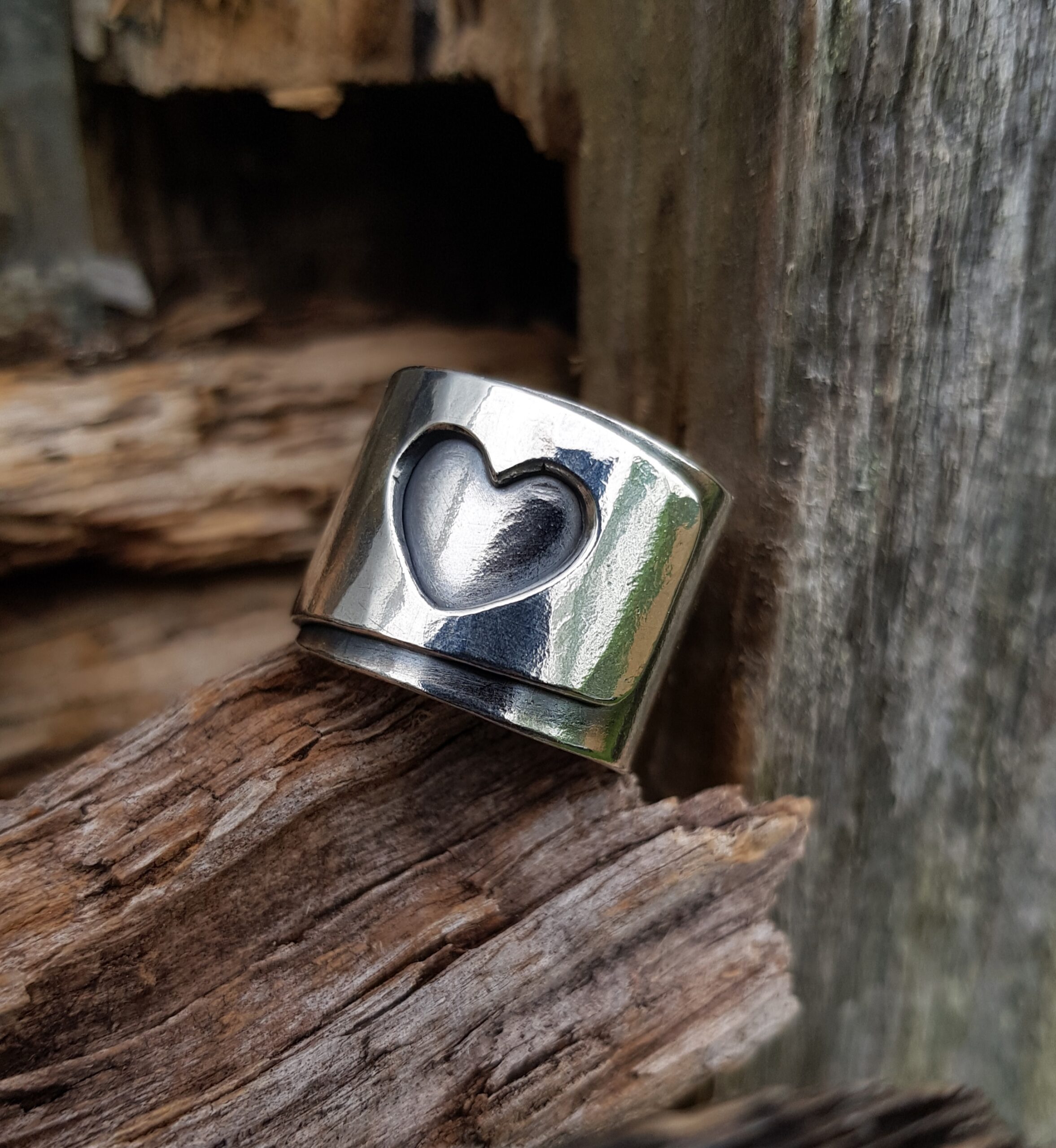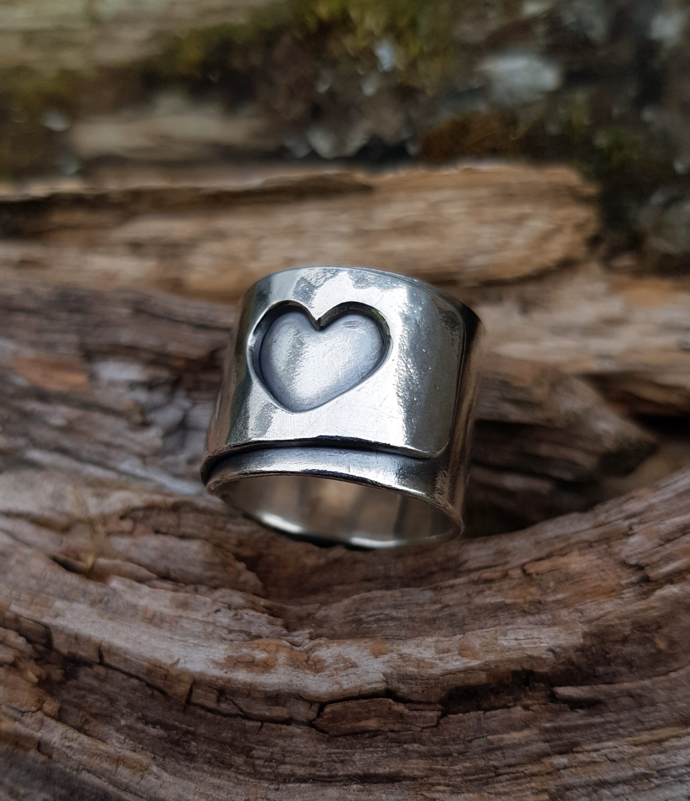 This ring is made out of a long strip of rustically hammered 1mm thick sterling silver sheet. The widest point is 16mm at one end and I taper it at the other end so that, once the ring has been wrapped, you can see the layering clearly. I hand cut a heart out of the narrower end of the strip and it sits on the top, creating a heartshaped window to the wider layer underneath. The heart is approximately 10mm wide. Every wrap ring is completely handmade so there will be slight variations but I do my best to ensure every ring is as close to the pictures you see here. The ring is oxidised, to show the detail more clearly, and then polished.