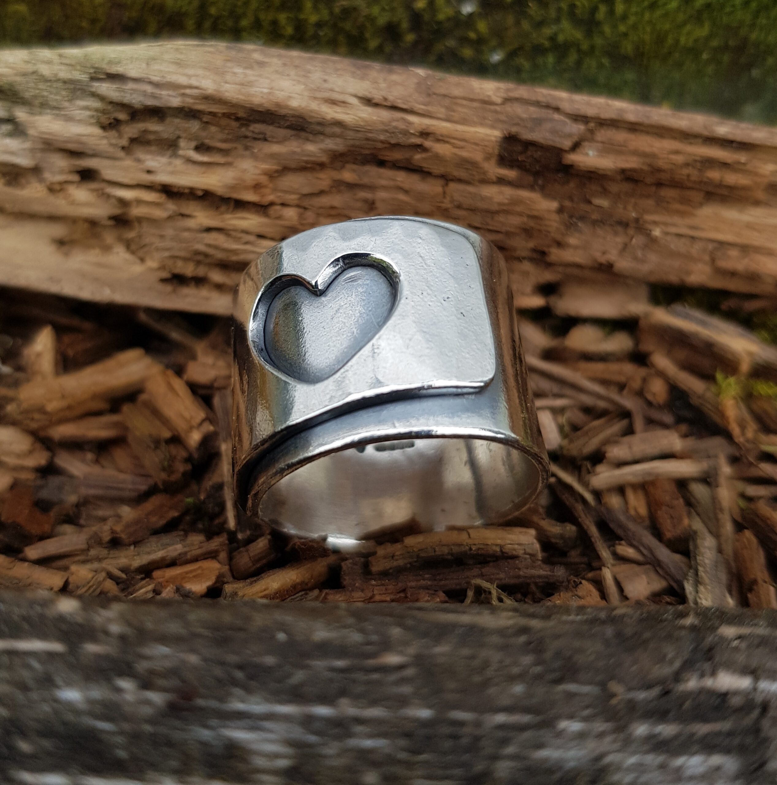 Wrap rings are the widest rings that I make and they are really quite chunky.  After experimenting with lots of different designs this is by far my favourite. Instead of my first wrap ring design, where a heart is added to the surface, with this ring I have cut a heart out, by hand, using a piercing saw.