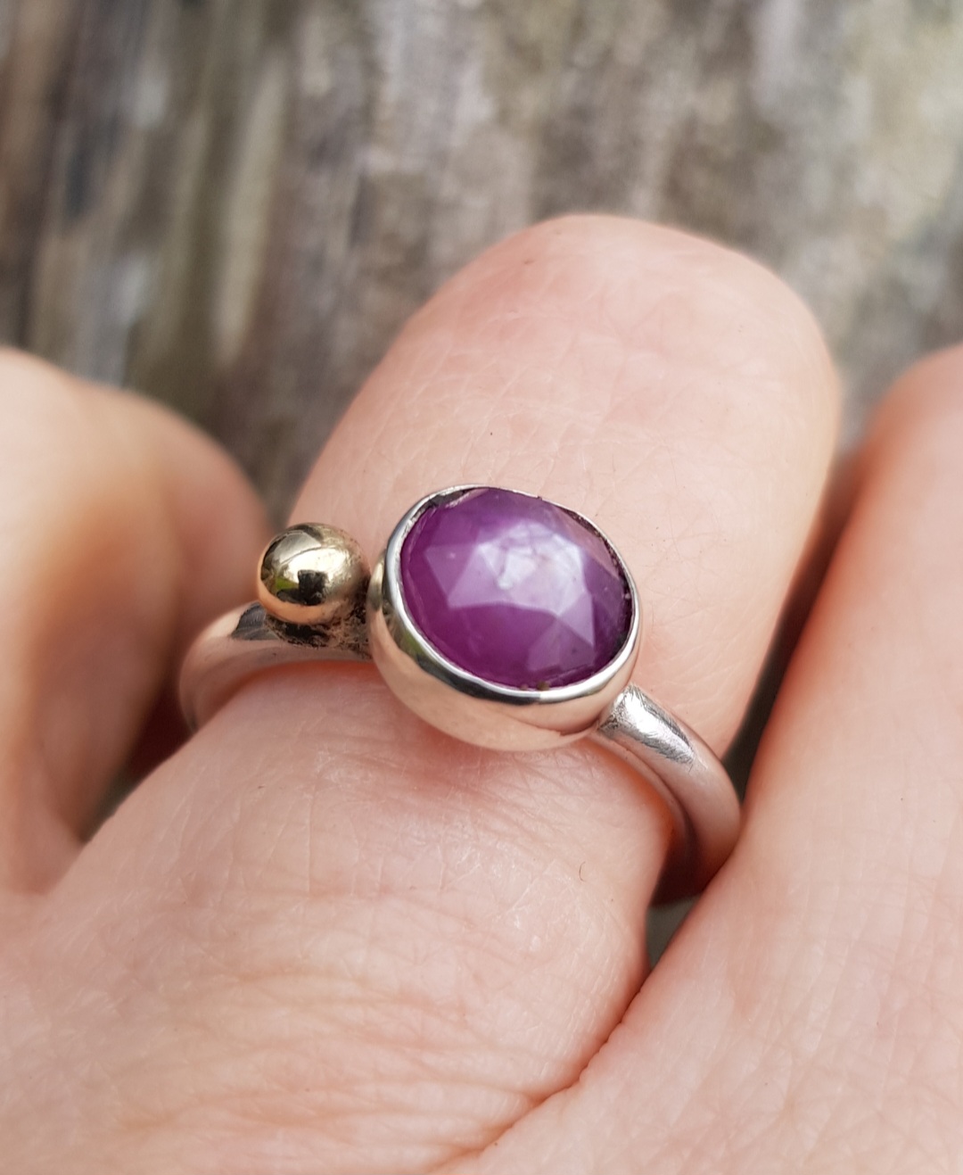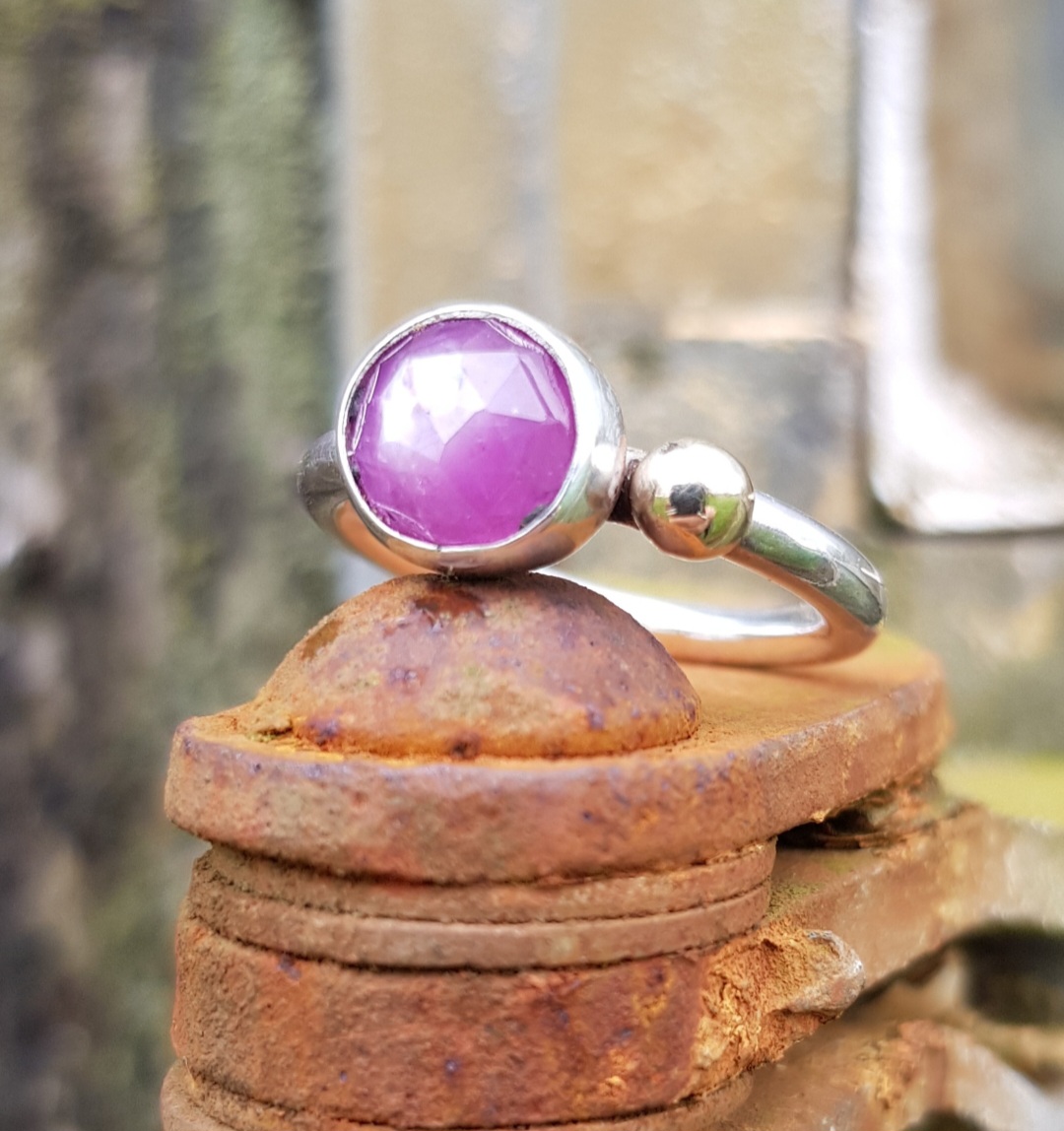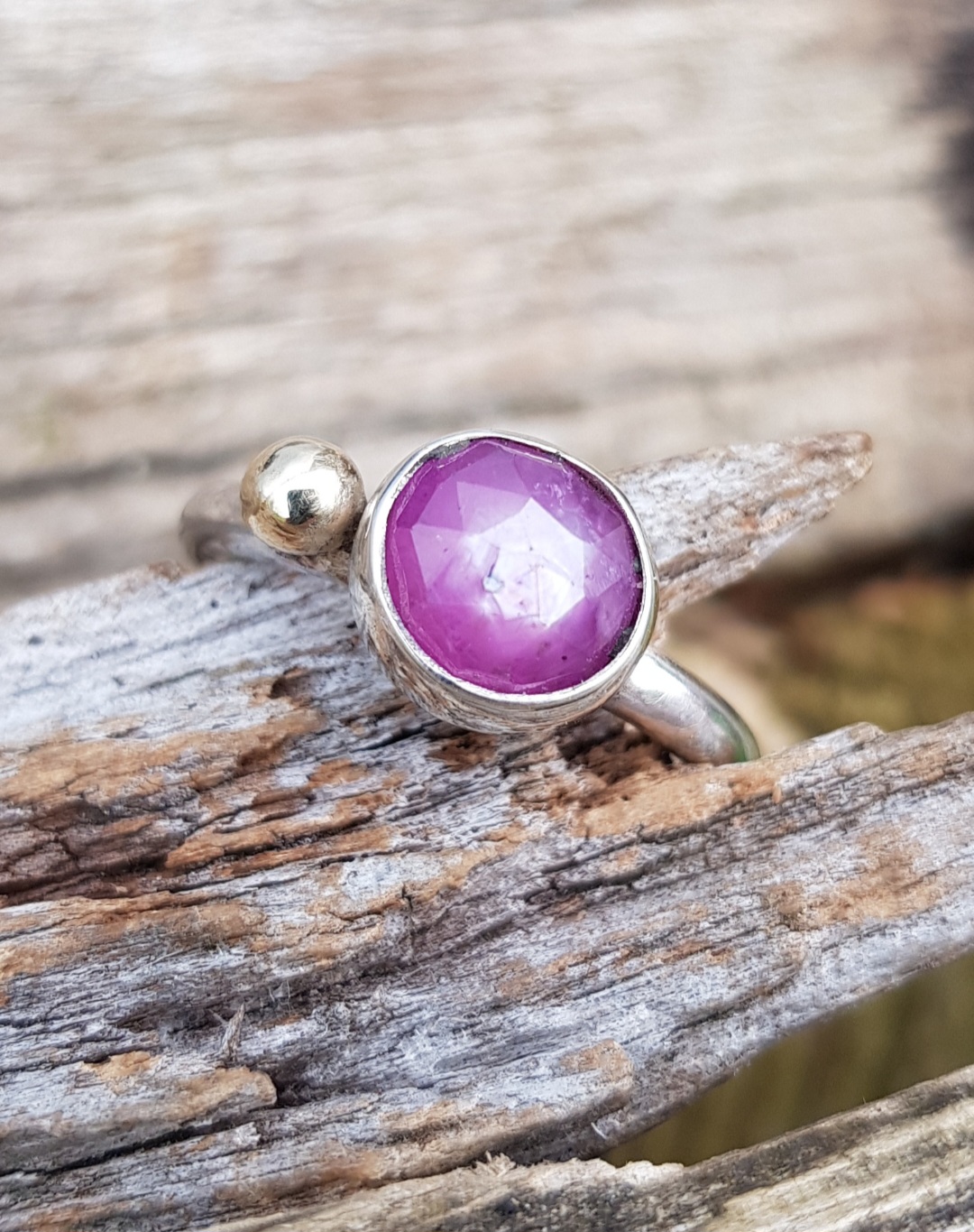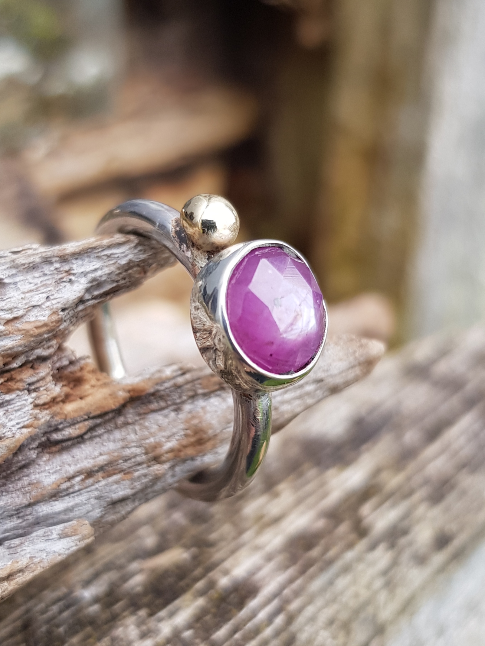 The Pink Sapphire has been set in a handmade sterling silver rub over setting and has a little solid 9ct yellow gold ball set next to it.
