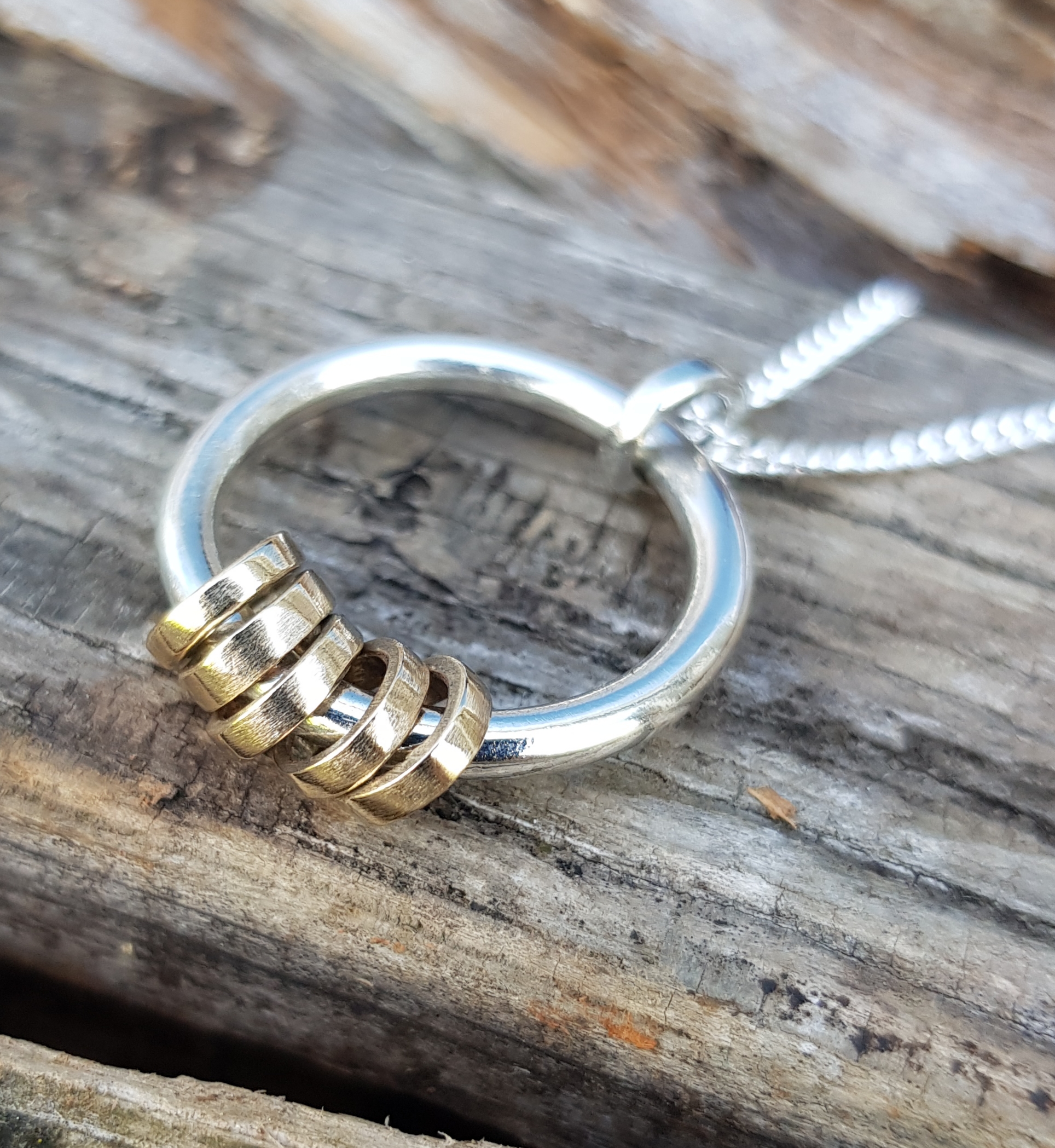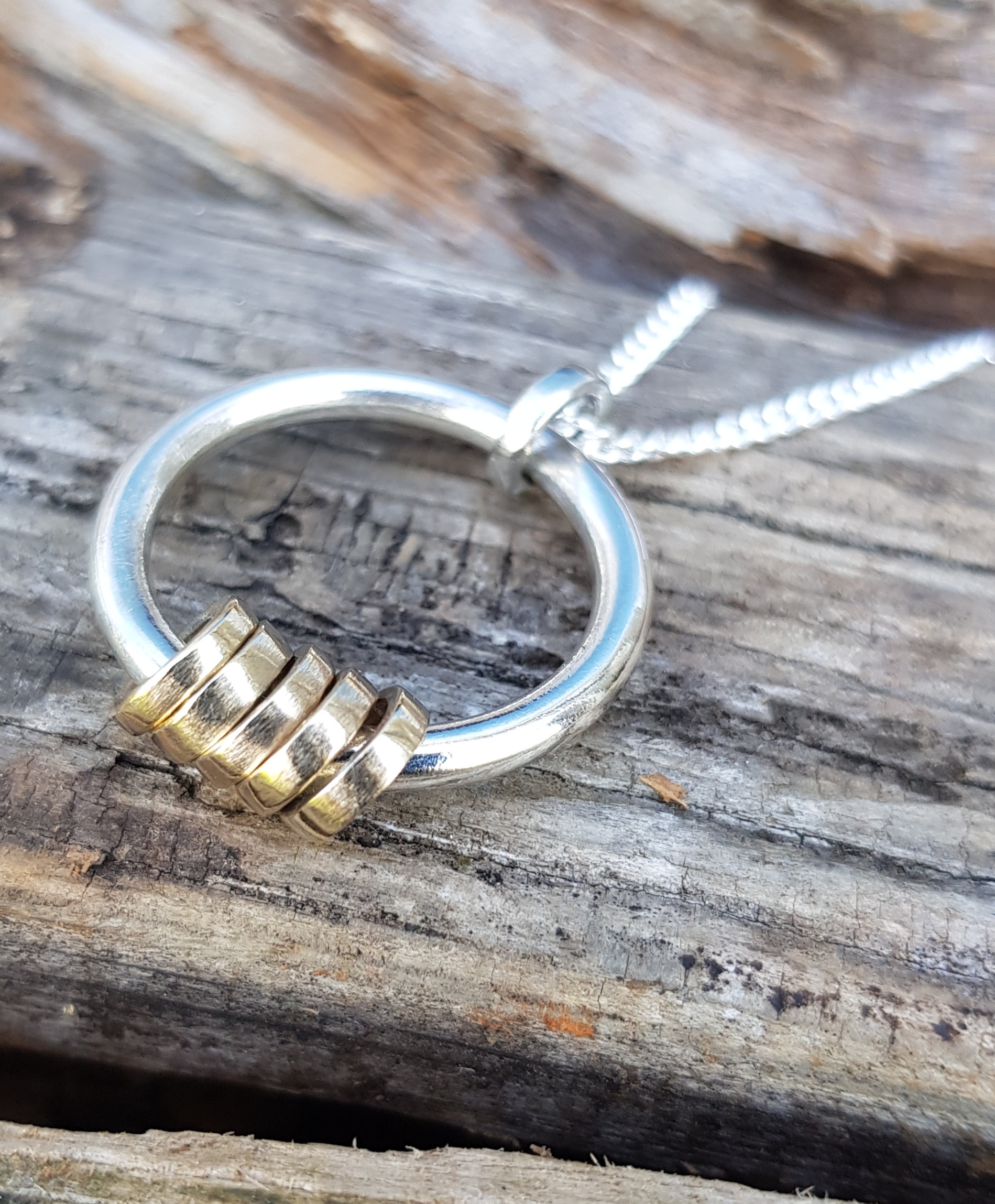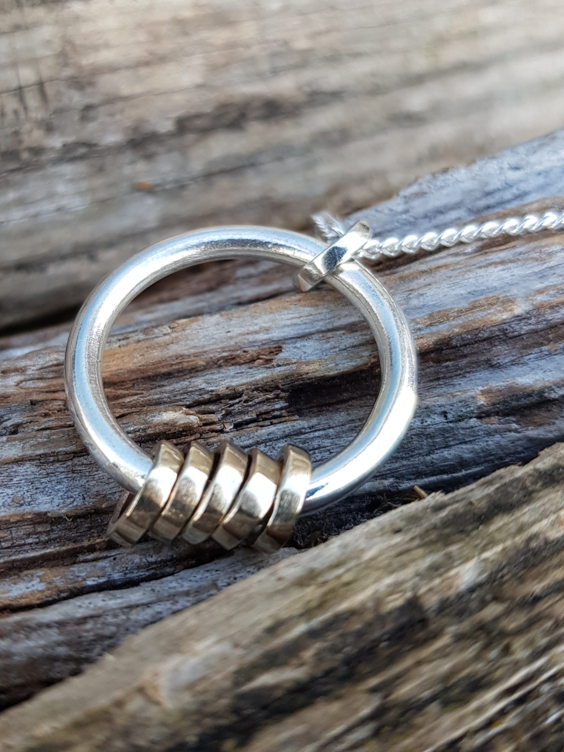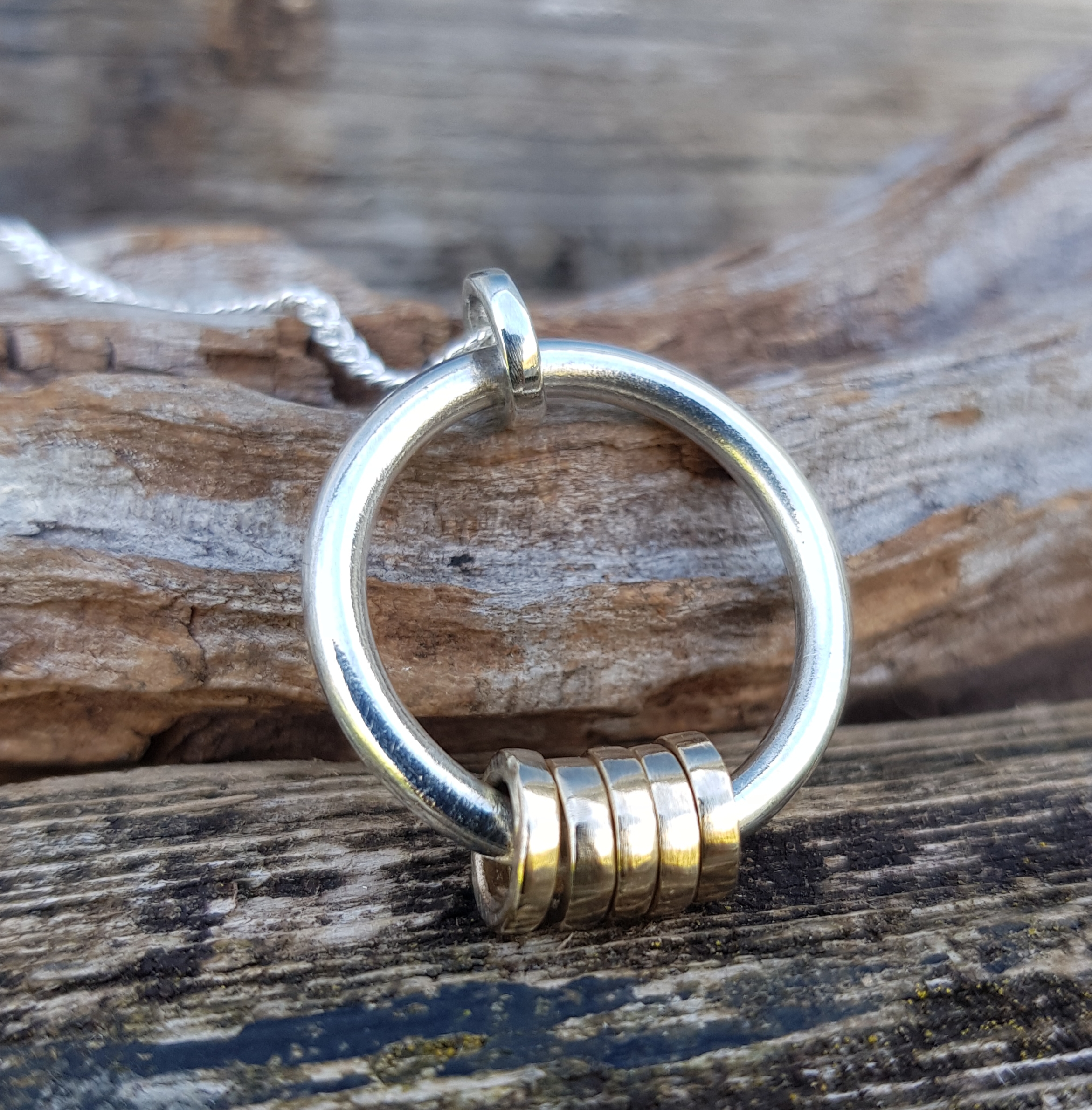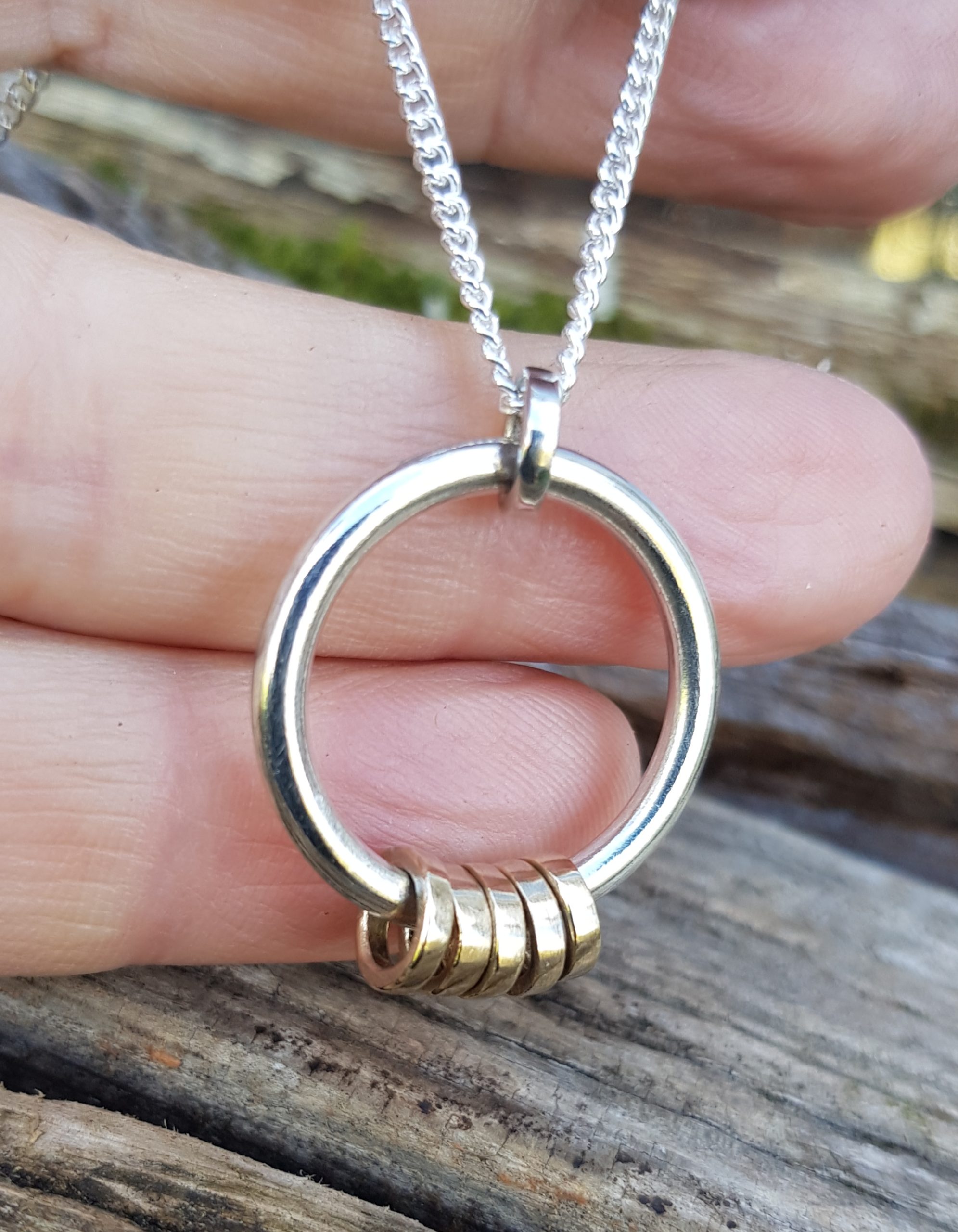 The base circle of the pendant is 2.5mm thick solid sterling silver round wire, which has been left smooth on both sides, and it measures approximately 22mm in diameter (the standard base ring is 16mm).  There are six rings – 1 is solid sterling silver (for the chain to run through at the top) and five are solid 9ct yellow gold. The five gold rings are designed to freely rotate the base circle.  The little rings are made out of 1.5mm thick round wire and each one is handmade and hammered flat to give it a squared off look.  The little rings are approximately 7mm in diameter.