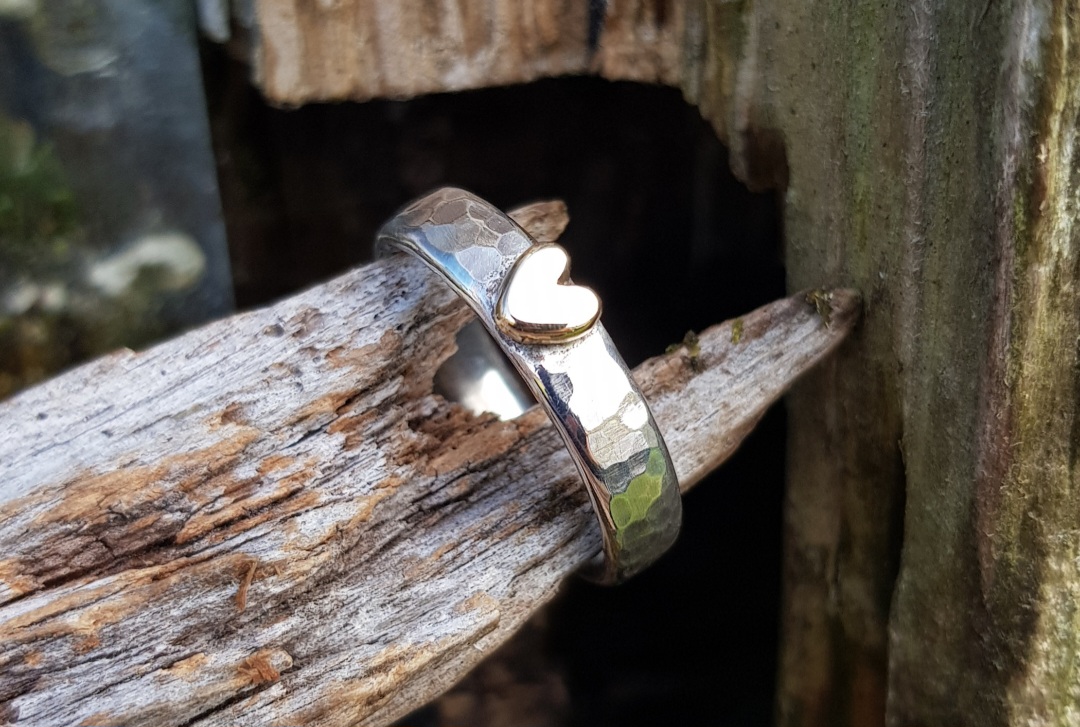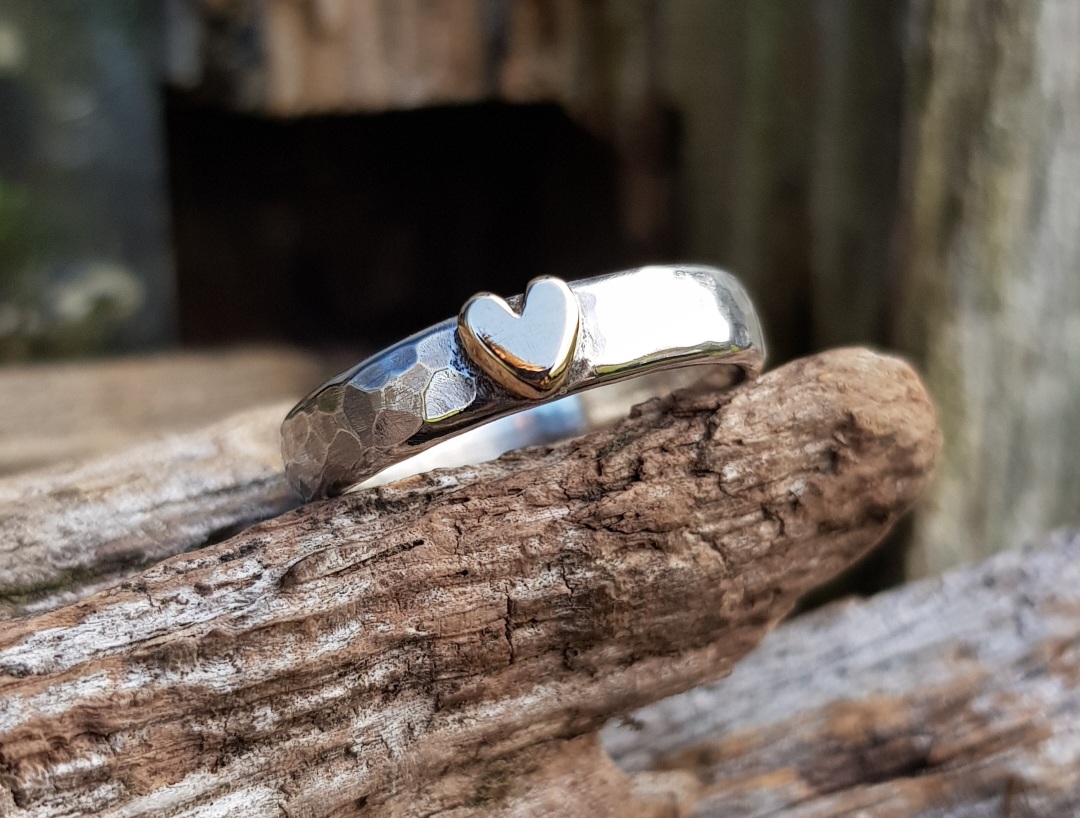 The addition of the sparkle texture and the 9ct yellow gold heart ensures that this ring has it all. The texture catches the light, making it extra bright and each gold heart is completely unique to each ring as it is carved and formed, by hand, out of a molten ball of solid 9ct gold off-cuts.