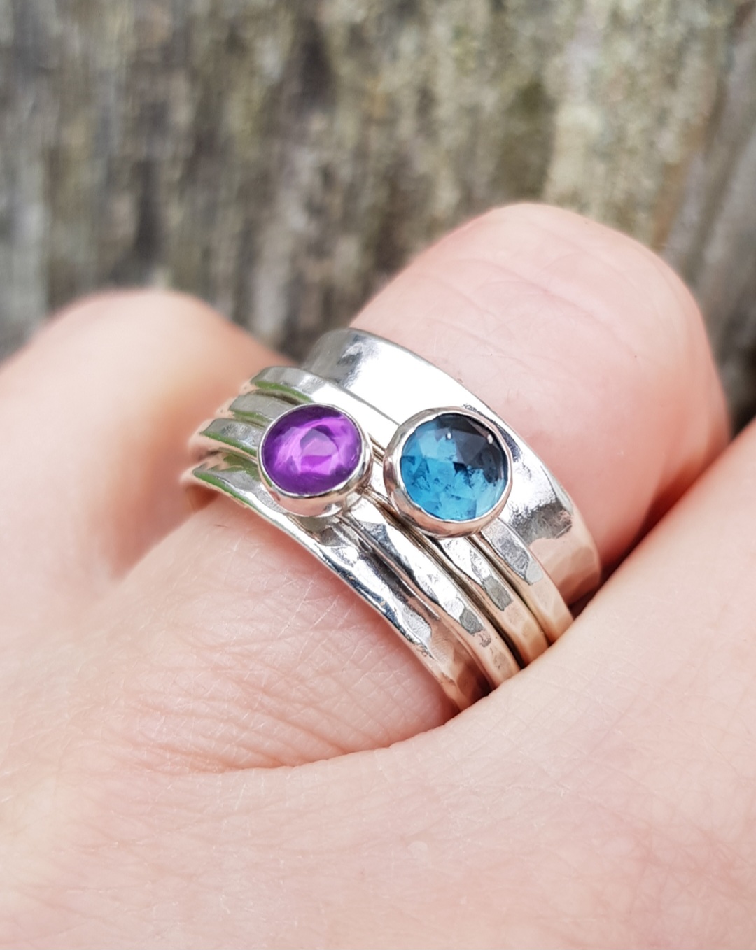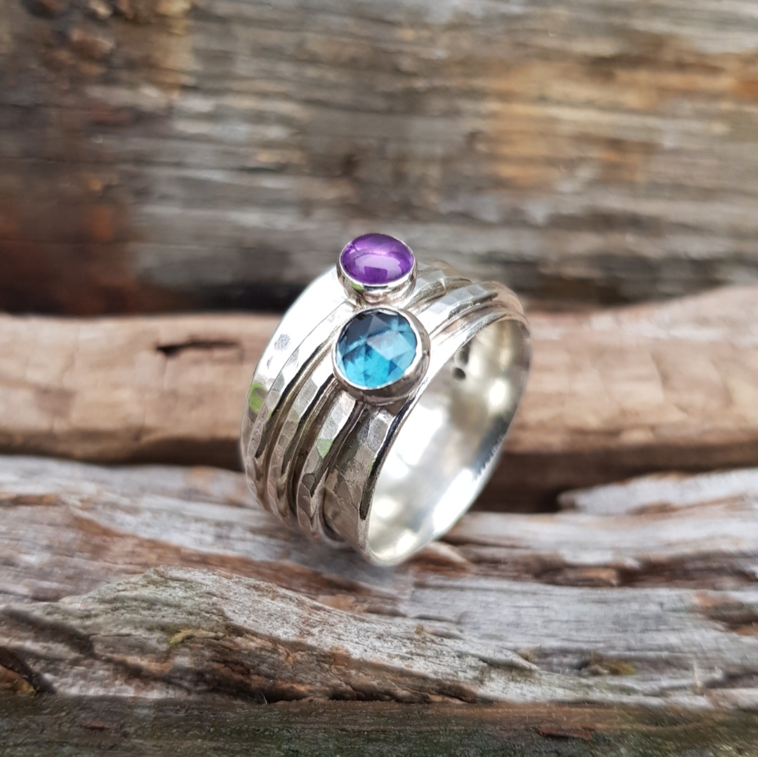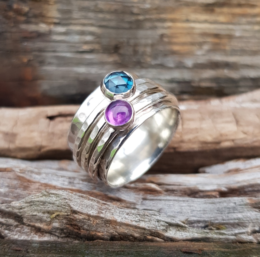 This solid sterling silver spinning ring has a base ring that is 1mm thick and 12mm in width and has been sparkle textured to catch the light. The three spinners are 1.8mm thick (also textured) and rotate the base ring individually. One spinner has a 6mm rose cut London Blue Topaz set on it, with a plain sparkle spacer ring in the middle, and the third has a 5mm Amethyst set on it.
