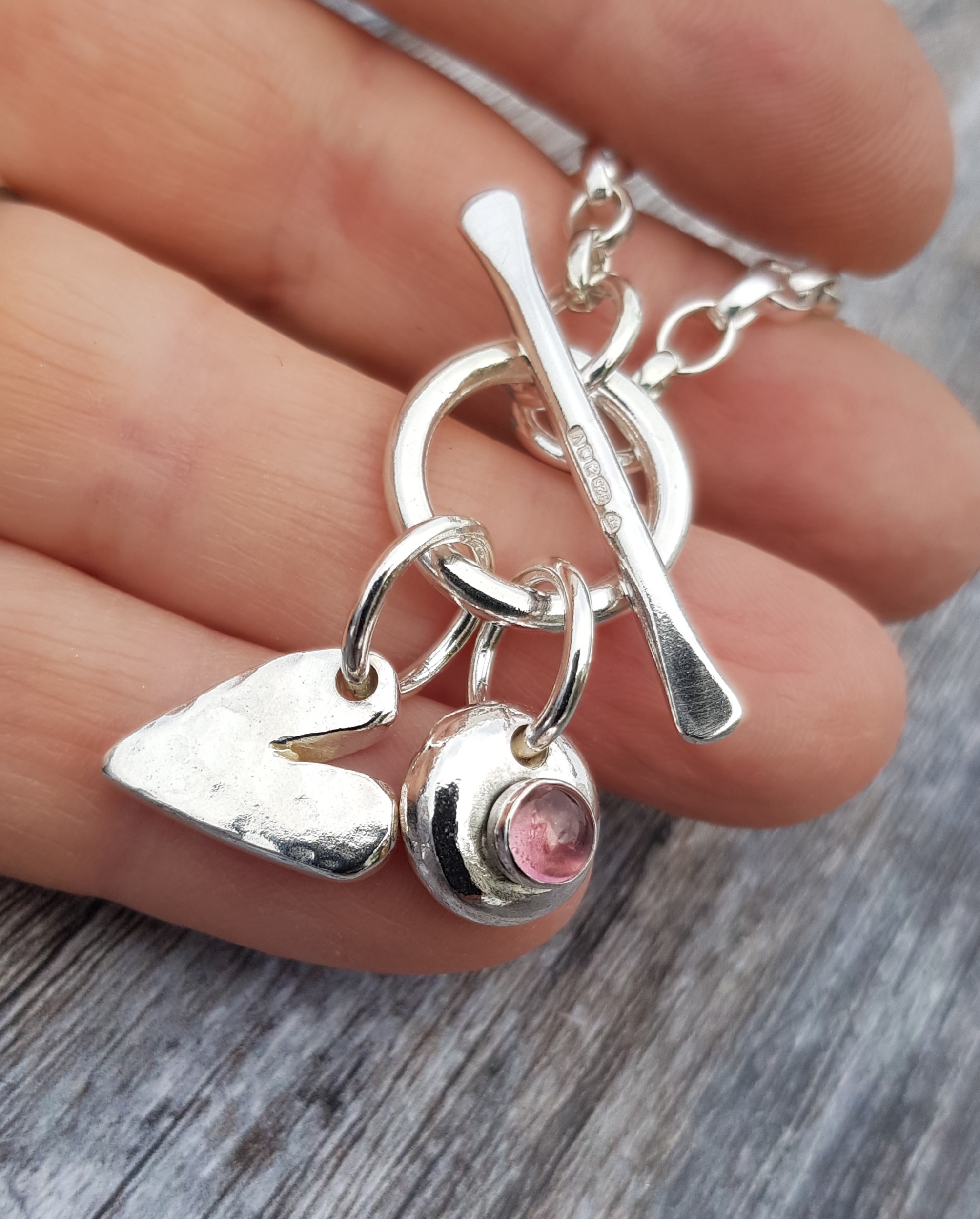 Apart from the chain the rest of this bracelet is handmade. The toggle closure has been made using 2.5mm thick round wire and is attached to the chunky, solid sterling silver, oval Belcher chain using handmade 1.5mm rings, which have been soldered closed. The two charms are attached to the circle part of the toggle closure with larger 1.5mm thick rings. One charm is a handcut heart, cut from 3mm thick sheet, which has been dimple textured and catches the light. The pebble charm weighs approximately 3.5g and, as with all my pebble charms, has a smooth top surface that has been filed and sanded with a heat textured base. On the top surface of the pebble a 5mm gemstone has been set. There is a choice of Rainbow Moonstone, Turquoise, Pink Rhodolite, Amethyst and Peridot for you to have on your pebble charm. If you would prefer a different gemstone, not listed, then please contact me to discuss. I always have a good stock of stones but prices do vary.